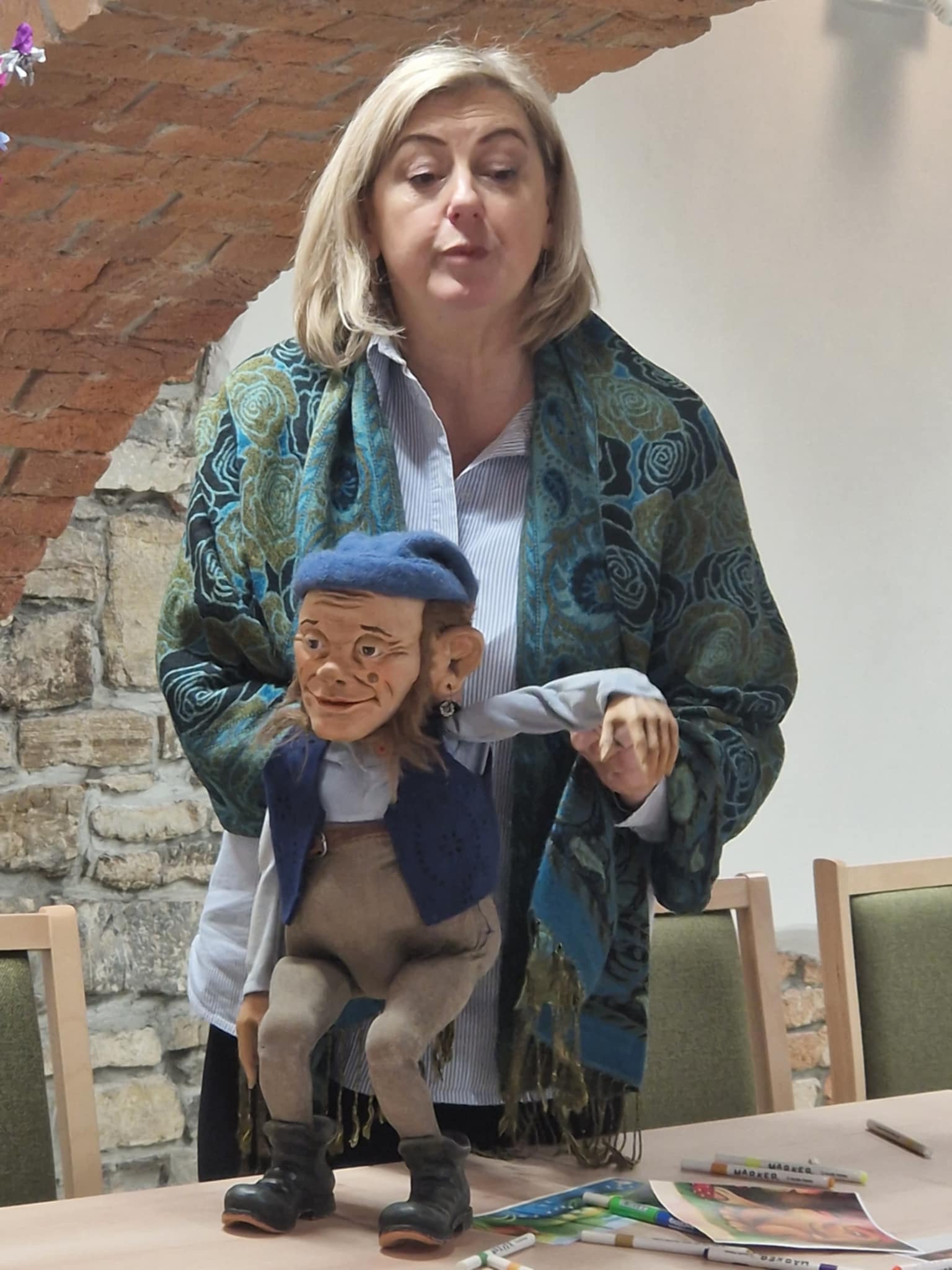 Później uczestniczyliśmy w opowieści dotyczącej niełatwej przeszłości członków tego rodu. Mogliśmy poznać bliżej ich wygląd, zwyczaje i zainteresowania przez oglądanie prezentacji zgromadzonych zdjęć. Podczas gdy starsi uczniowie byli ukierunkowani na poznanie historycznego tła, młodsi zapoznawali się z bohaterami bajki Zofii Kossak „ Kłopoty Kacperka góreckiego skrzata", który był „dobrym duchem" dworku w Górkach Wielkich.