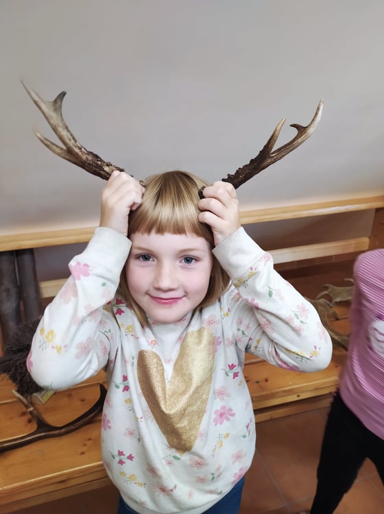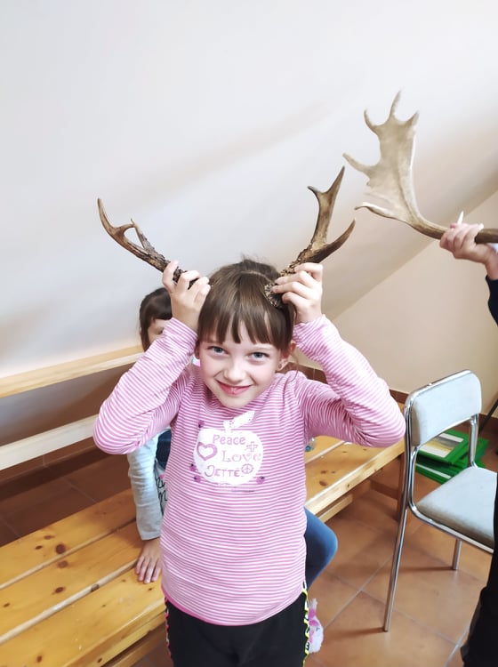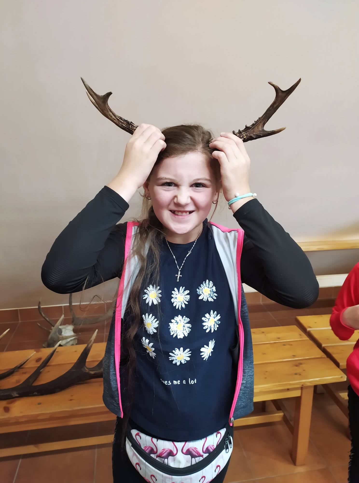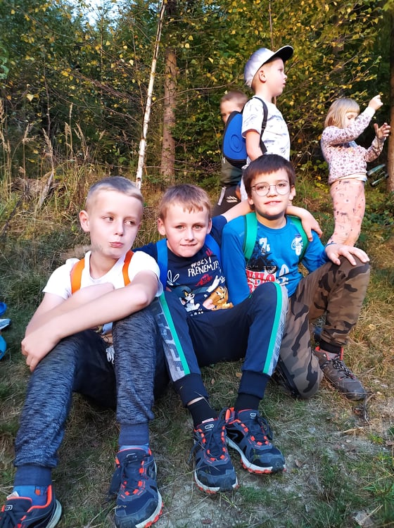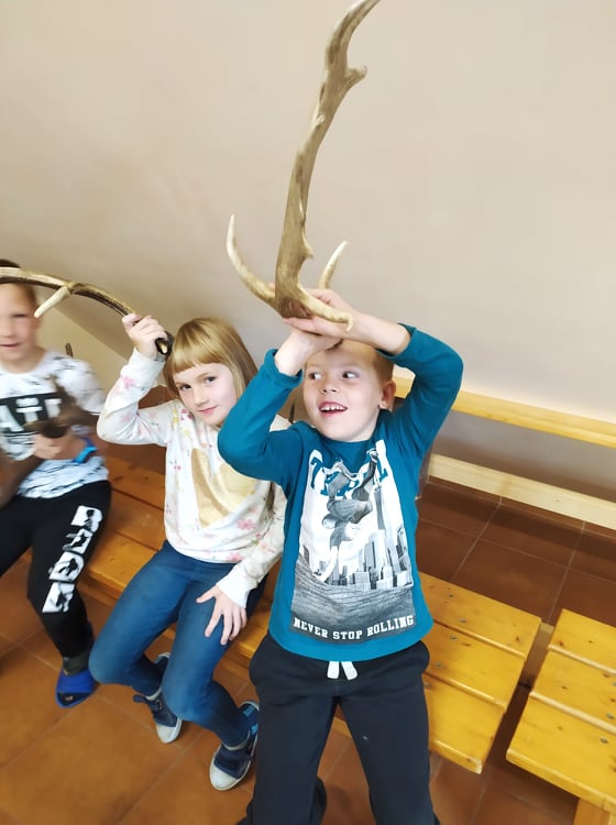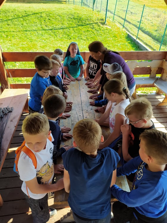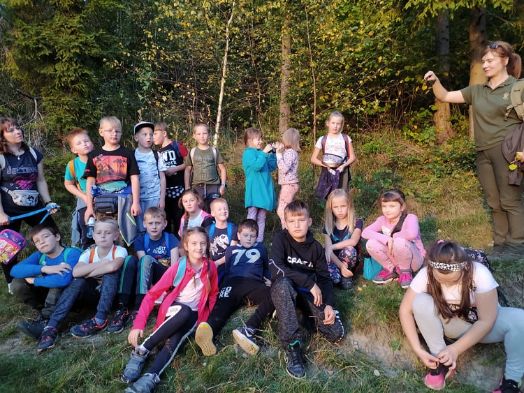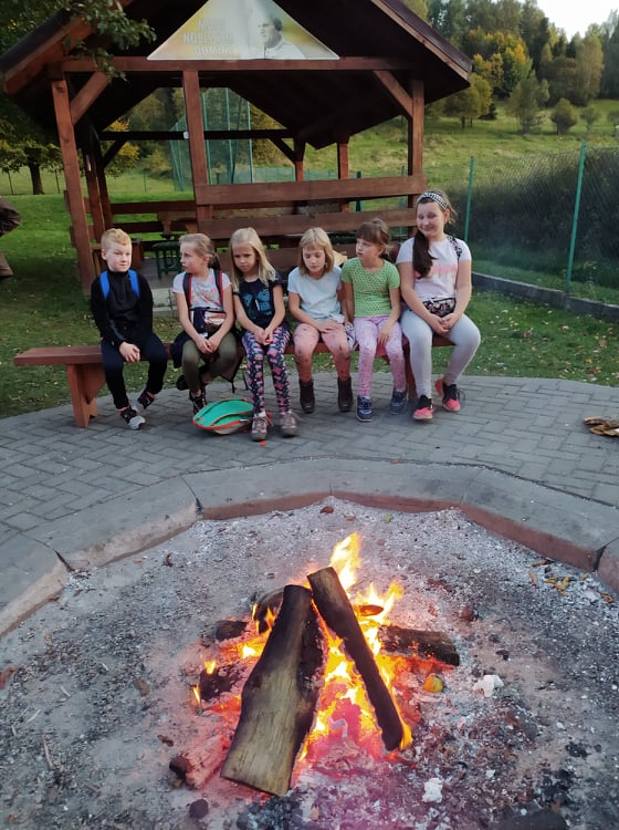 Po przyjeździe rozlokowaliśmy się w pokojach. O ile rozmieszczenie bagaży i powyciąganie wszelkich przywiezionych przytulanek i smakołyków poszło błyskawicznie , o tyle z ubieraniem pościeli nie było już tak łatwo. Gdy wszystko już było gotowe, zjedliśmy pyszny obiad i wymaszerowaliśmy z panią leśnik na wyprawę w góry. Pogoda była przepiękna, a opowieści pani przewodnik fascynujące, szczególnie, że na każdym postoju wyciągała ze swojego plecaka jakieś ciekawe pomoce. Trasa okazała się dość długa i wróciliśmy chwilę przed zapadnięciem zmroku. Na miejscu czekało już na nas ognisko, kiełbaski i przygotowane przez p. Asię wesołe zabawy integracyjne. Potem już tylko została toaleta wieczorna, wyciszające gry w pokojach,ciche czuwanie i udało się… wszyscy śpią!