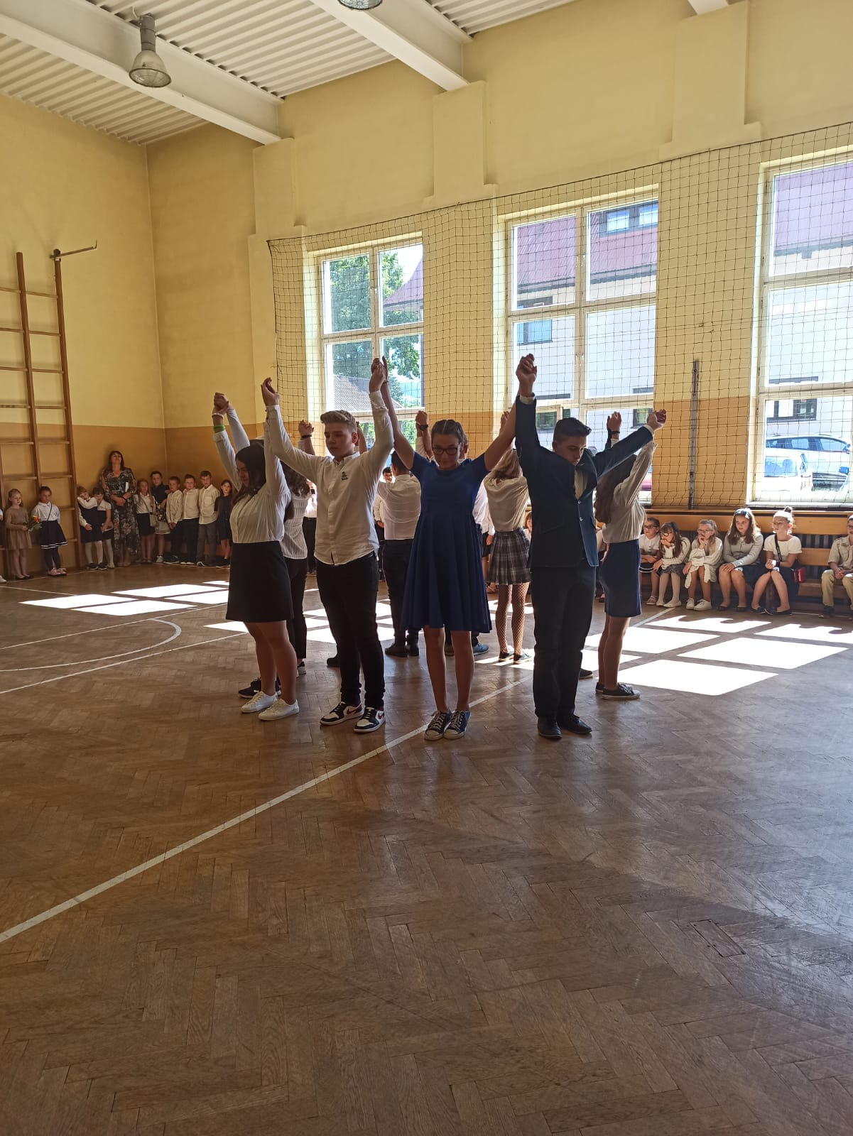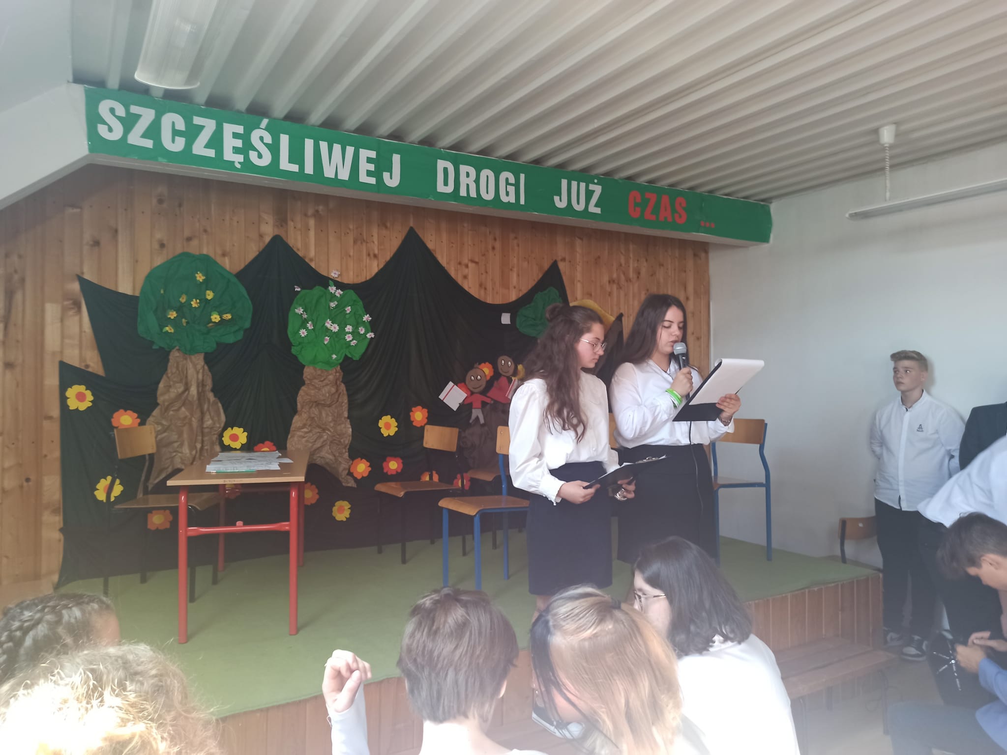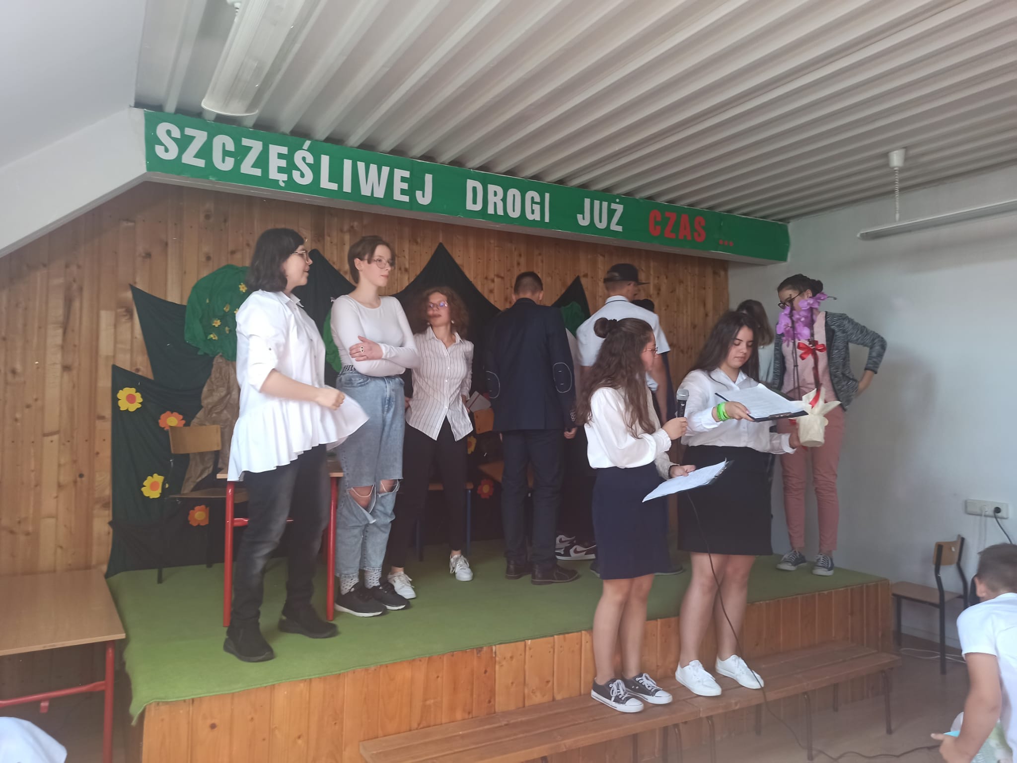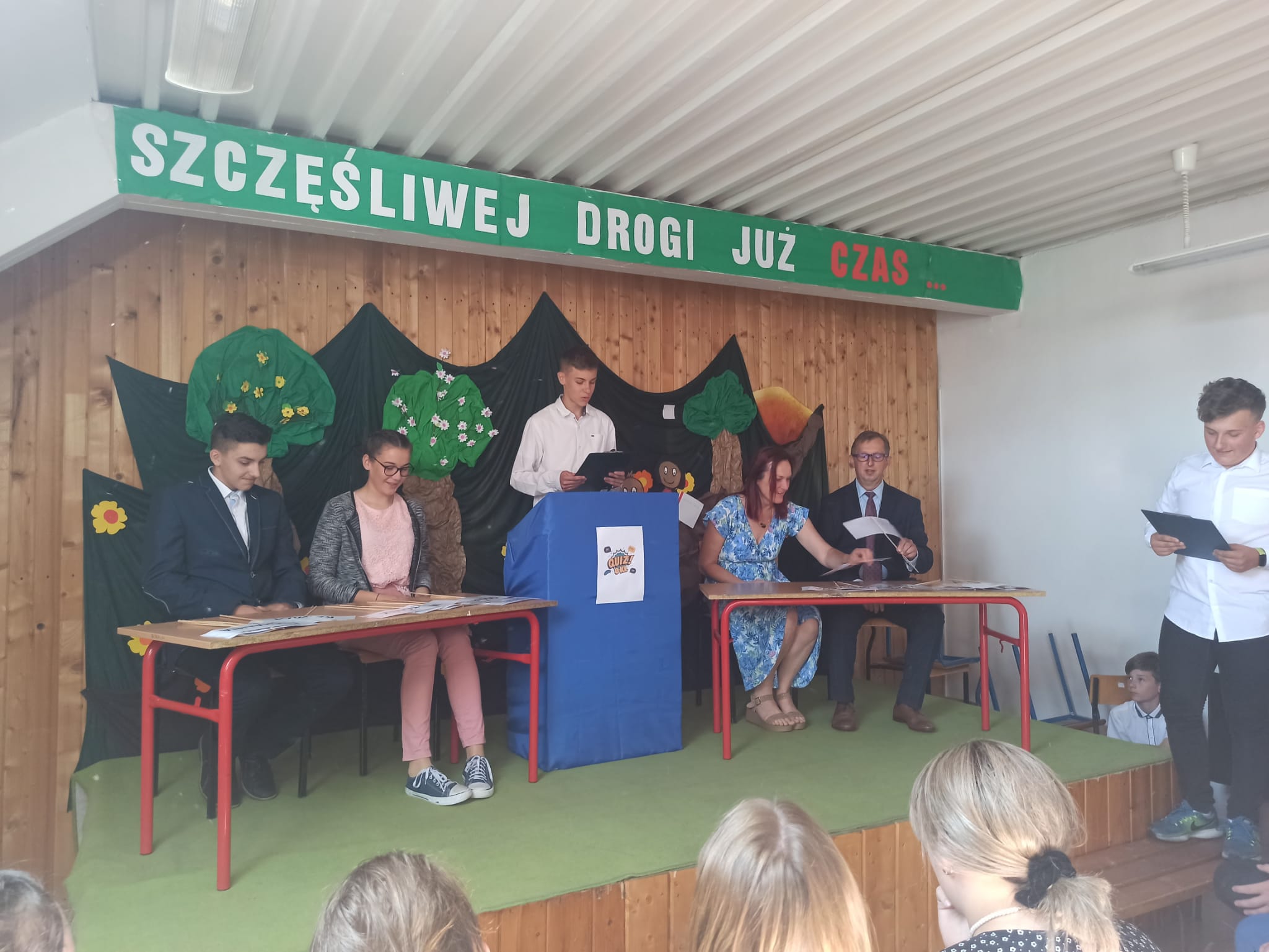 z absolwentką Michaliną Haratyk. Po piosence odbył się quiz, który poprowadził Filip Niwczyk z klasy VII, a do gry zaprosił 2 przedstawicieli 8. klasy oraz 2 nauczycieli tam uczących. Śmiechu było co niemiara. Na koniec Gabrysia Małyjurek odczytała wiersz Andrzeja Dragona pt. „Klasa siódma żegna ósmą”. Ósmoklasiści dostali na pamiątkę kubki ze zdjęciem swojej całej klasy oraz zbiór fraszek o nich samych.