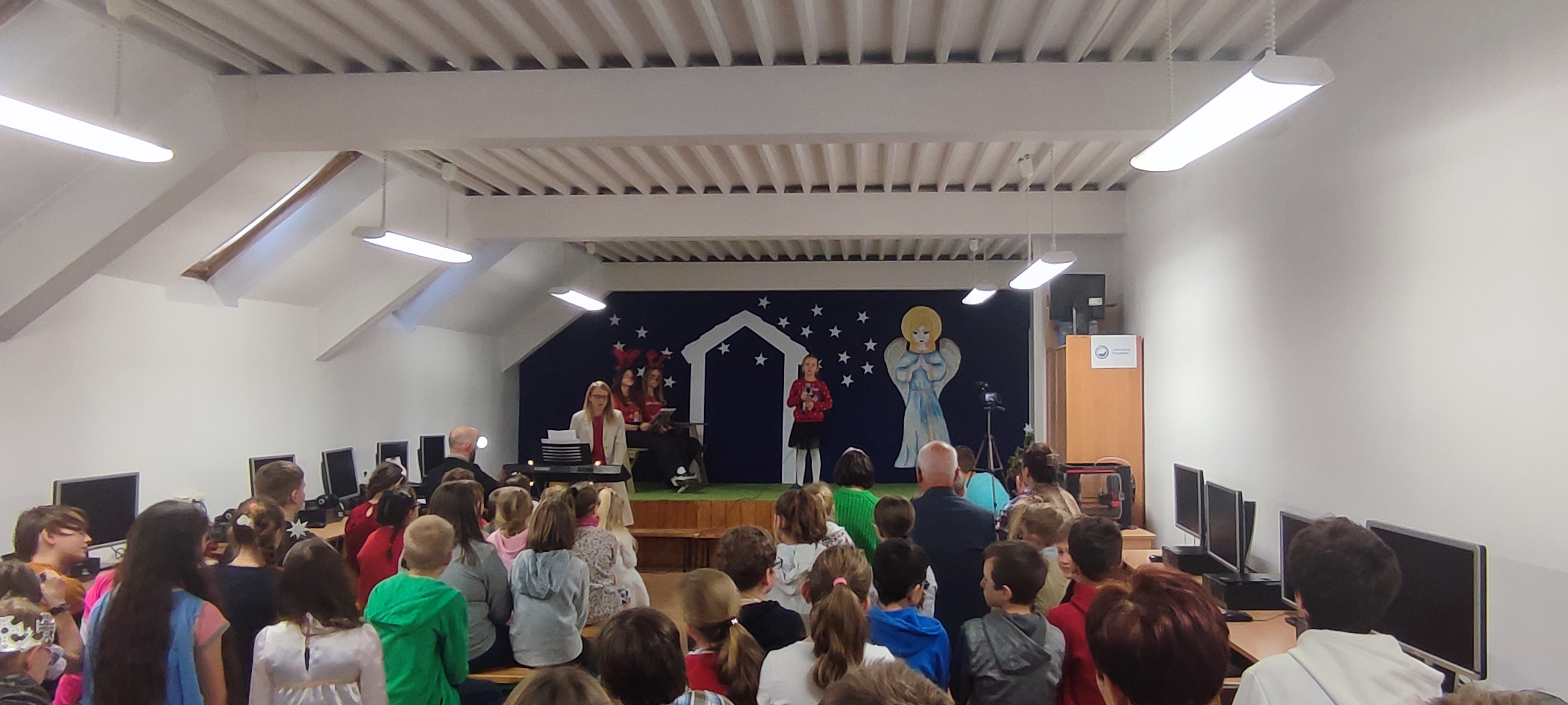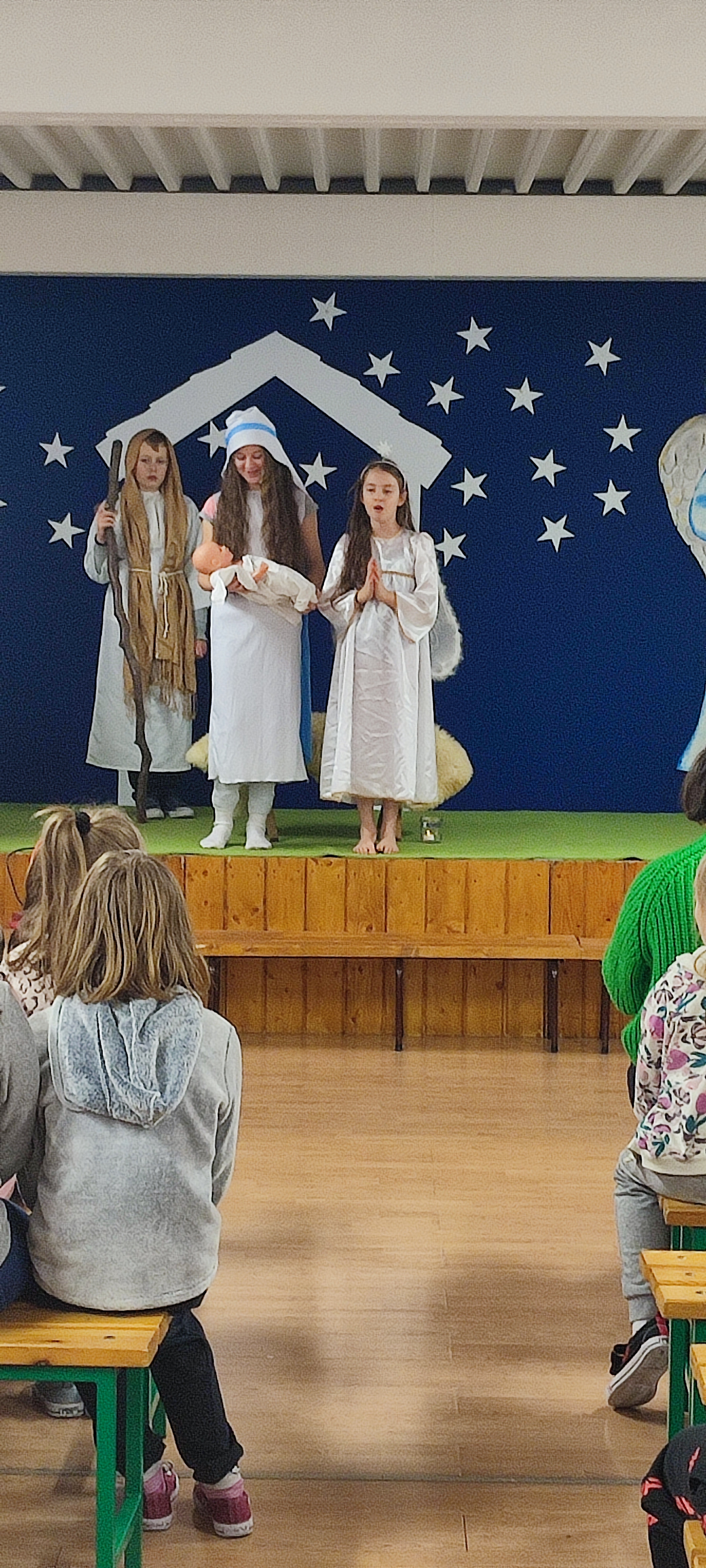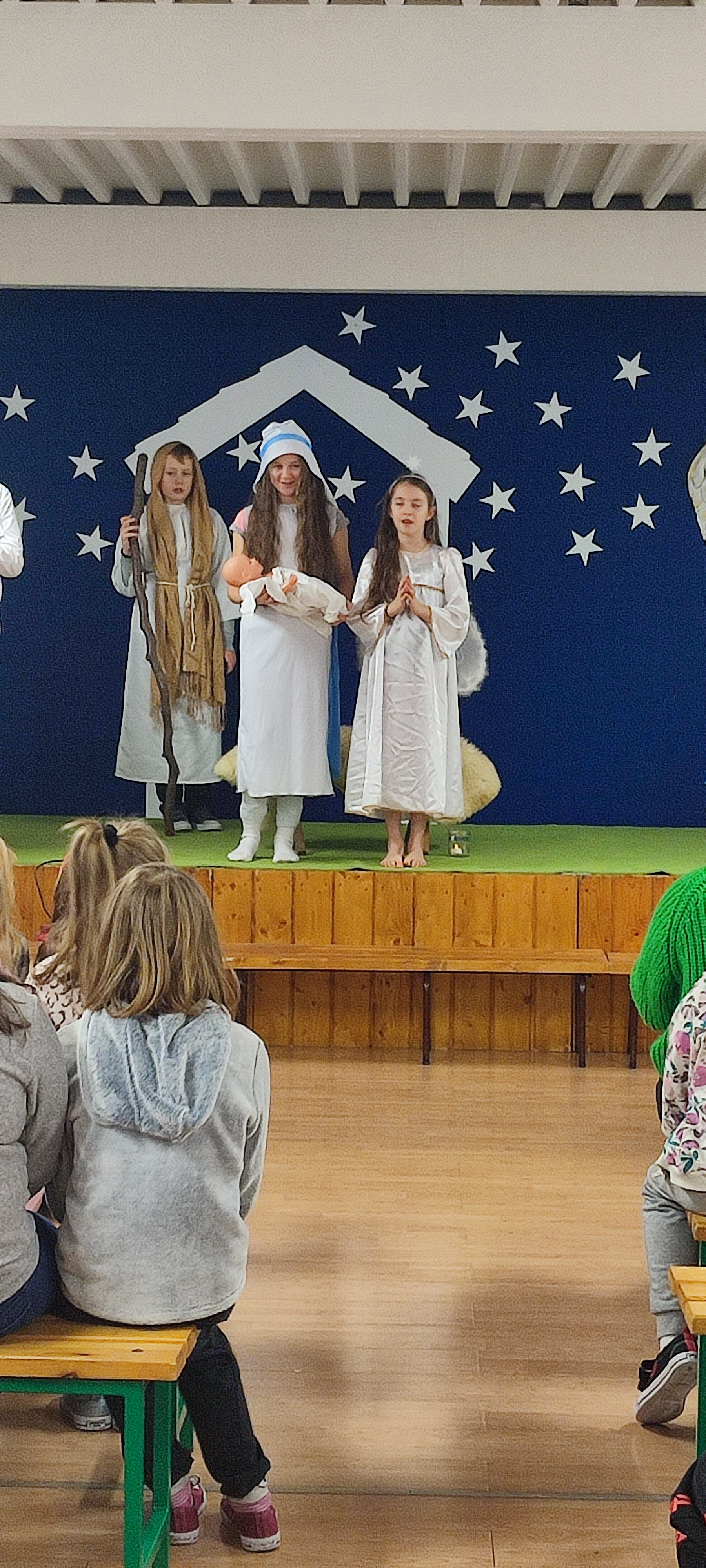 Najpierw w inscenizacji jasełek wystąpiły dzieci z młodszych klas (0,1,2,4), przygotowane przez panie Edytę Kukuczkę i Barbarę Dymarek. Innowacją był wpleciony w jasełka wzruszający taniec dzieci z lampionami. Następnie odbył się minikoncert świąteczny, w którym można było usłyszeć śpiewające i grające dzieci ze wszystkich klas, które wspomagał na gitarze pan Piotr Kohut, a którym akompaniowała na keyboardzie pani Natalia Mucha. Dzieci, poczynając od najmłodszych do najstarszych, wykonały różne świąteczne utwory: ballady, kolędy, pastorałki, a na koniec wszyscy zaśpiewali „Wśród nocnej ciszy” oraz „Pójdźmy wszyscy do stajenki”, a połaźnicy złożyli życzenia. Pan dyrektor Bogdan Ligocki podsumował występy, przypominając, co jest istotą Świąt Bożego Narodzenia.