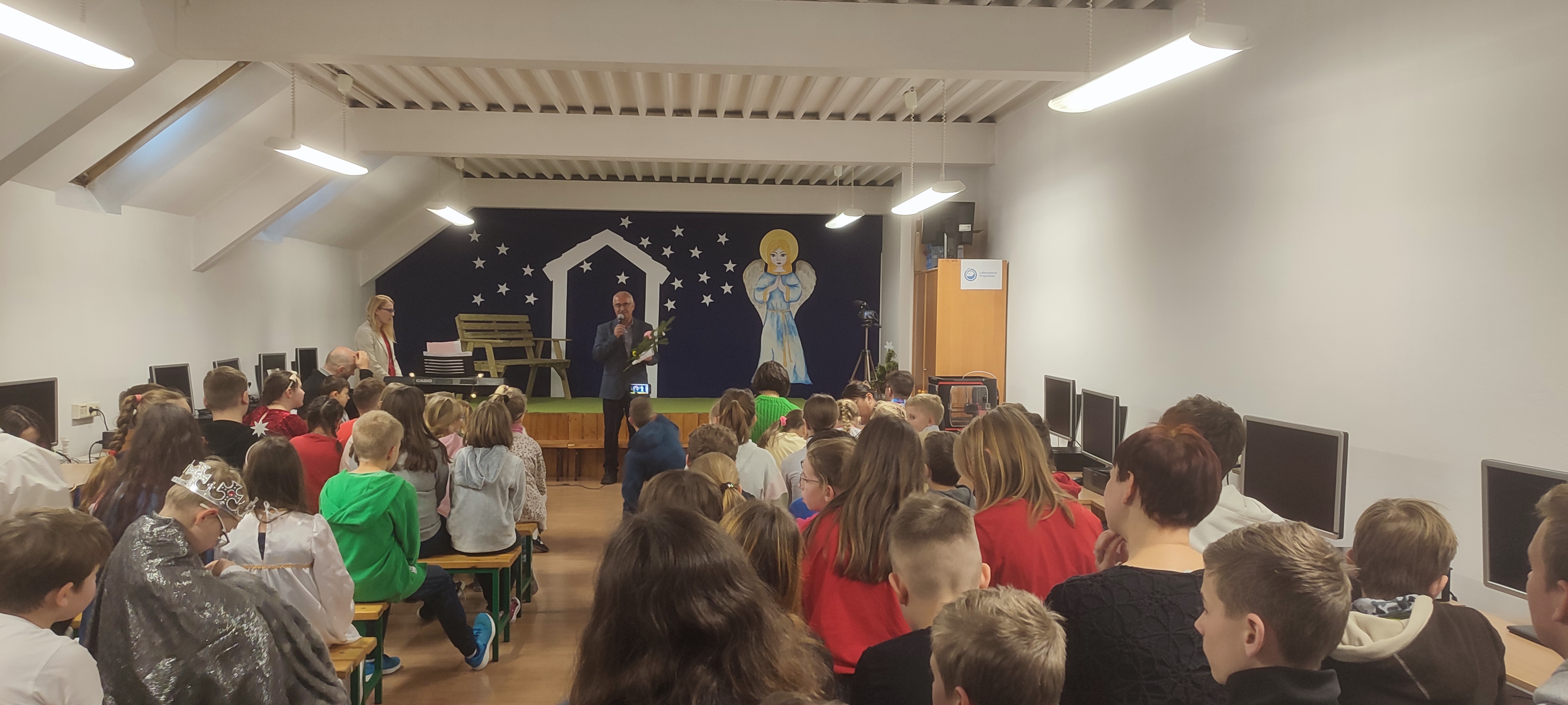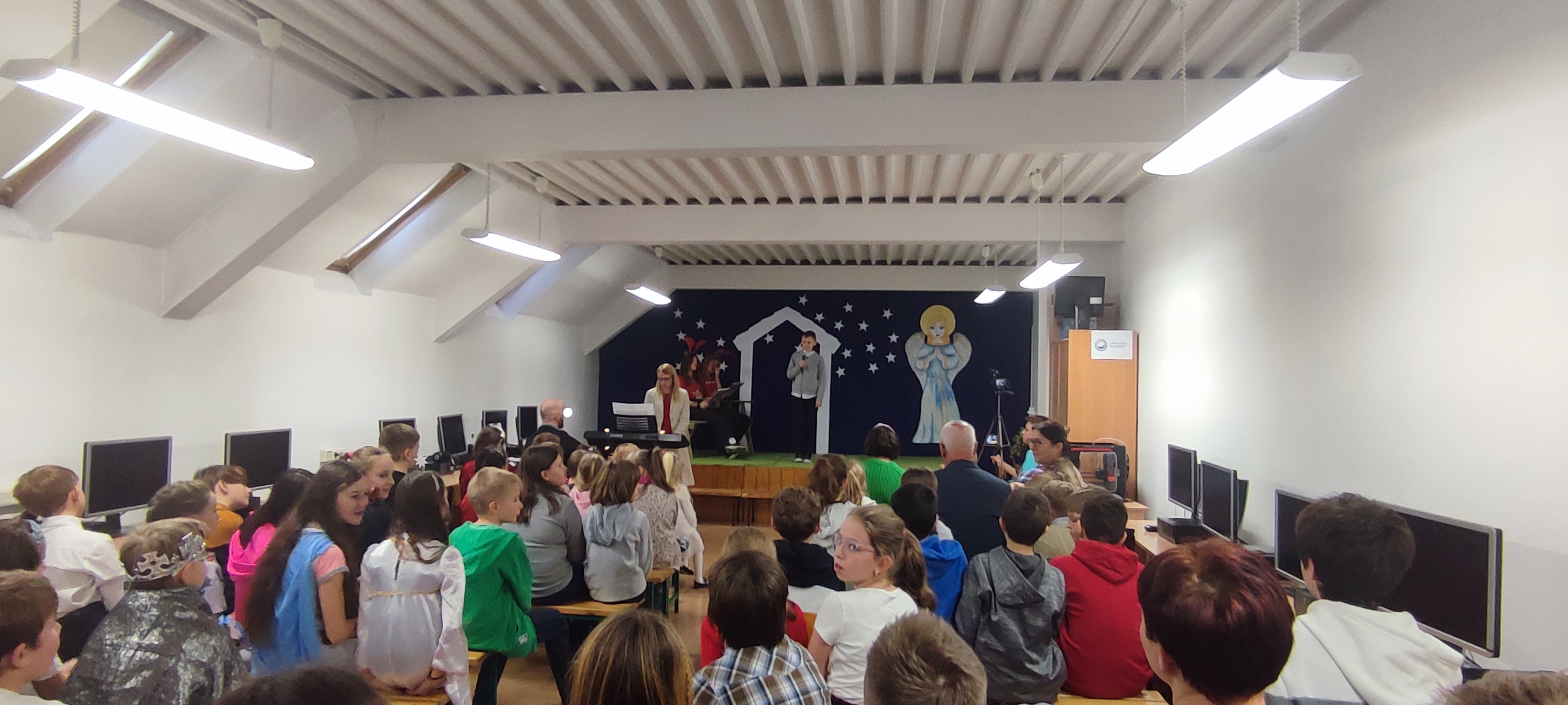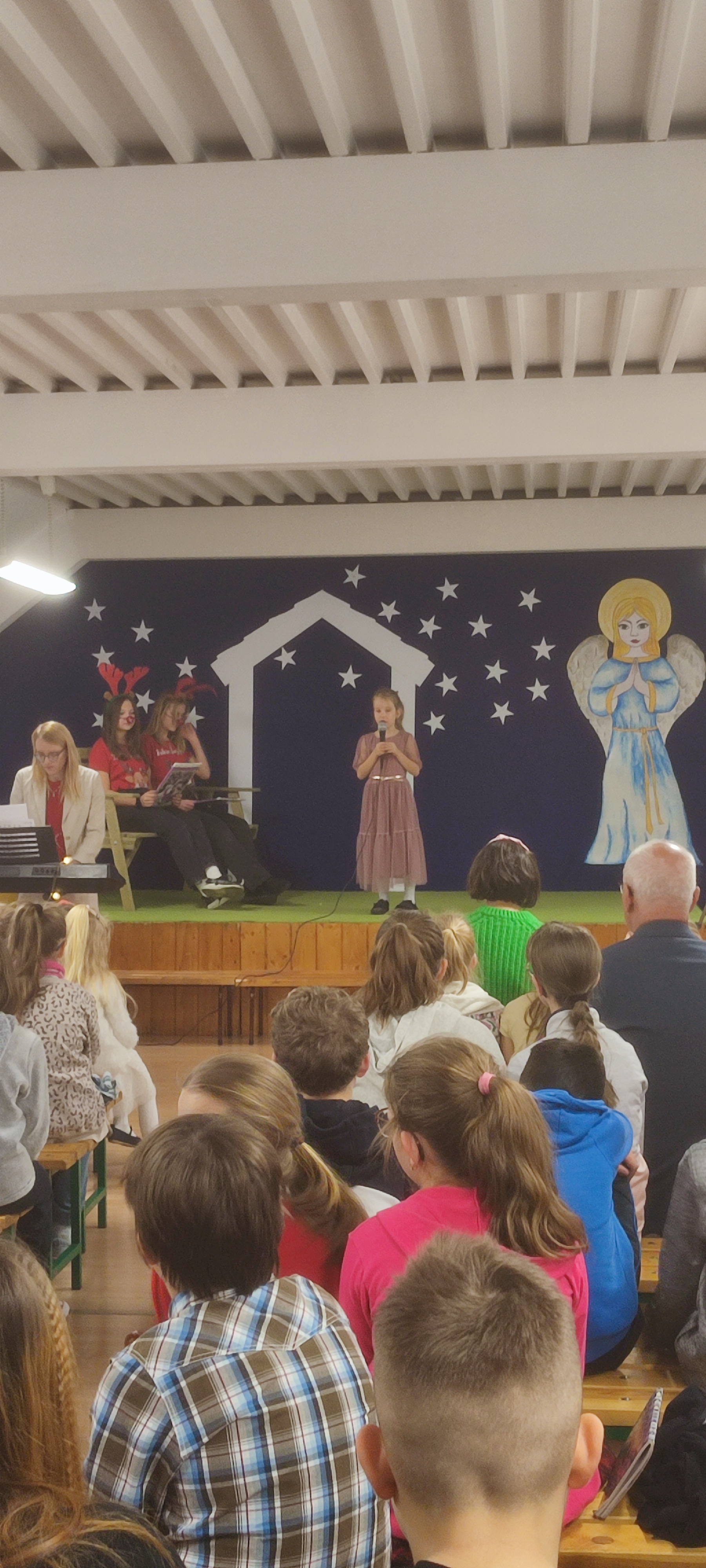 Najpierw w inscenizacji jasełek wystąpiły dzieci z młodszych klas (0,1,2,4), przygotowane przez panie Edytę Kukuczkę i Barbarę Dymarek. Innowacją był wpleciony w jasełka wzruszający taniec dzieci z lampionami. Następnie odbył się minikoncert świąteczny, w którym można było usłyszeć śpiewające i grające dzieci ze wszystkich klas, które wspomagał na gitarze pan Piotr Kohut, a którym akompaniowała na keyboardzie pani Natalia Mucha. Dzieci, poczynając od najmłodszych do najstarszych, wykonały różne świąteczne utwory: ballady, kolędy, pastorałki, a na koniec wszyscy zaśpiewali „Wśród nocnej ciszy” oraz „Pójdźmy wszyscy do stajenki”, a połaźnicy złożyli życzenia. Pan dyrektor Bogdan Ligocki podsumował występy, przypominając, co jest istotą Świąt Bożego Narodzenia.