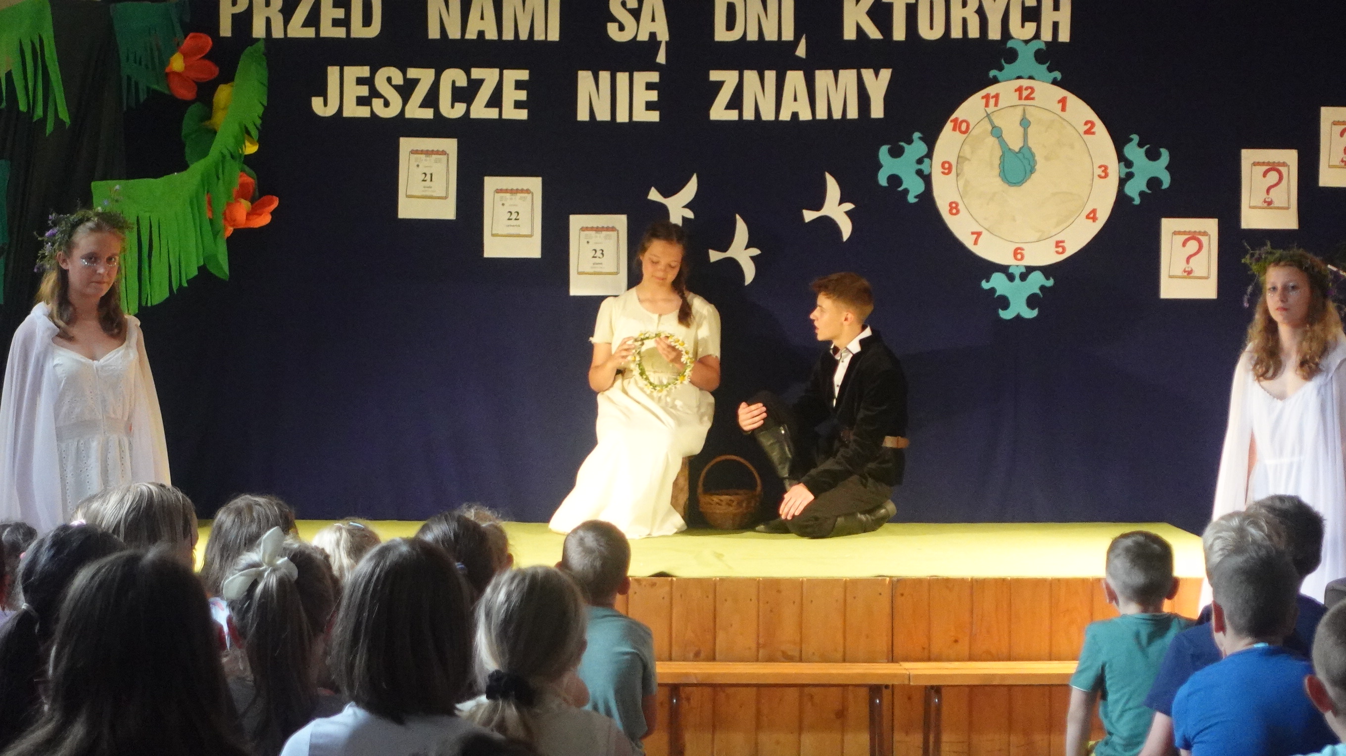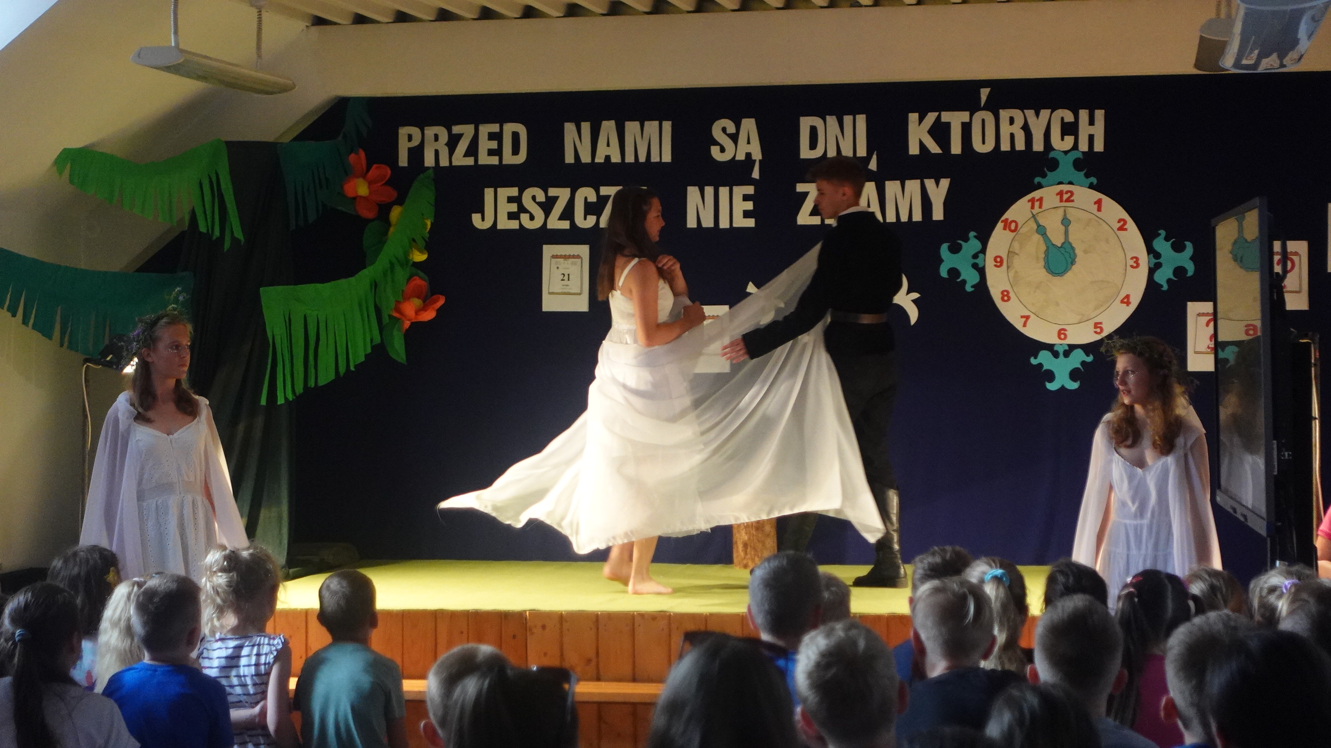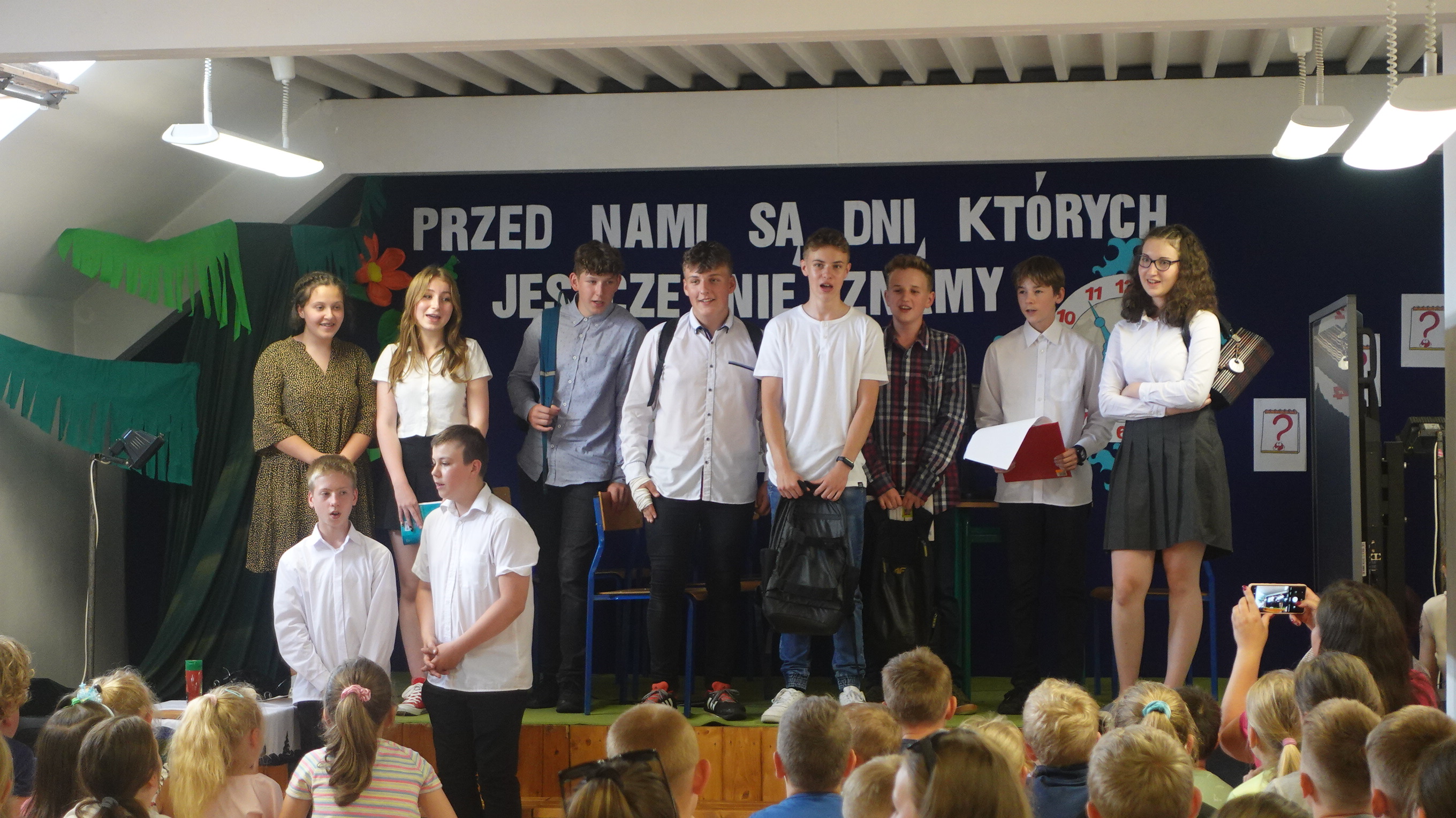 Uroczyste pożegnanie rozpoczęło się od przedstawienia "Świtezianka" w wykonaniu Zosi, Anais, Zuzi i Filipa, pod opieką p. Iwony Bogdał. Po krótkiej przerwie uczniowie kl. 7 z wych. p.Elą Goryczką pożegnali na wesoło starszych kolegów, przeprowadzając "Test wiedzy o ucznich kl.8". W konkurencji brały udział dwie drużyny: nauczycieli i ósmoklasistów.Następnie odchodzący ósmoklasiści wystąpili w skeczu o szkole i swoich nauczycielach oraz podziękowali za 9 lat spędzonych w murach naszej szkoły.