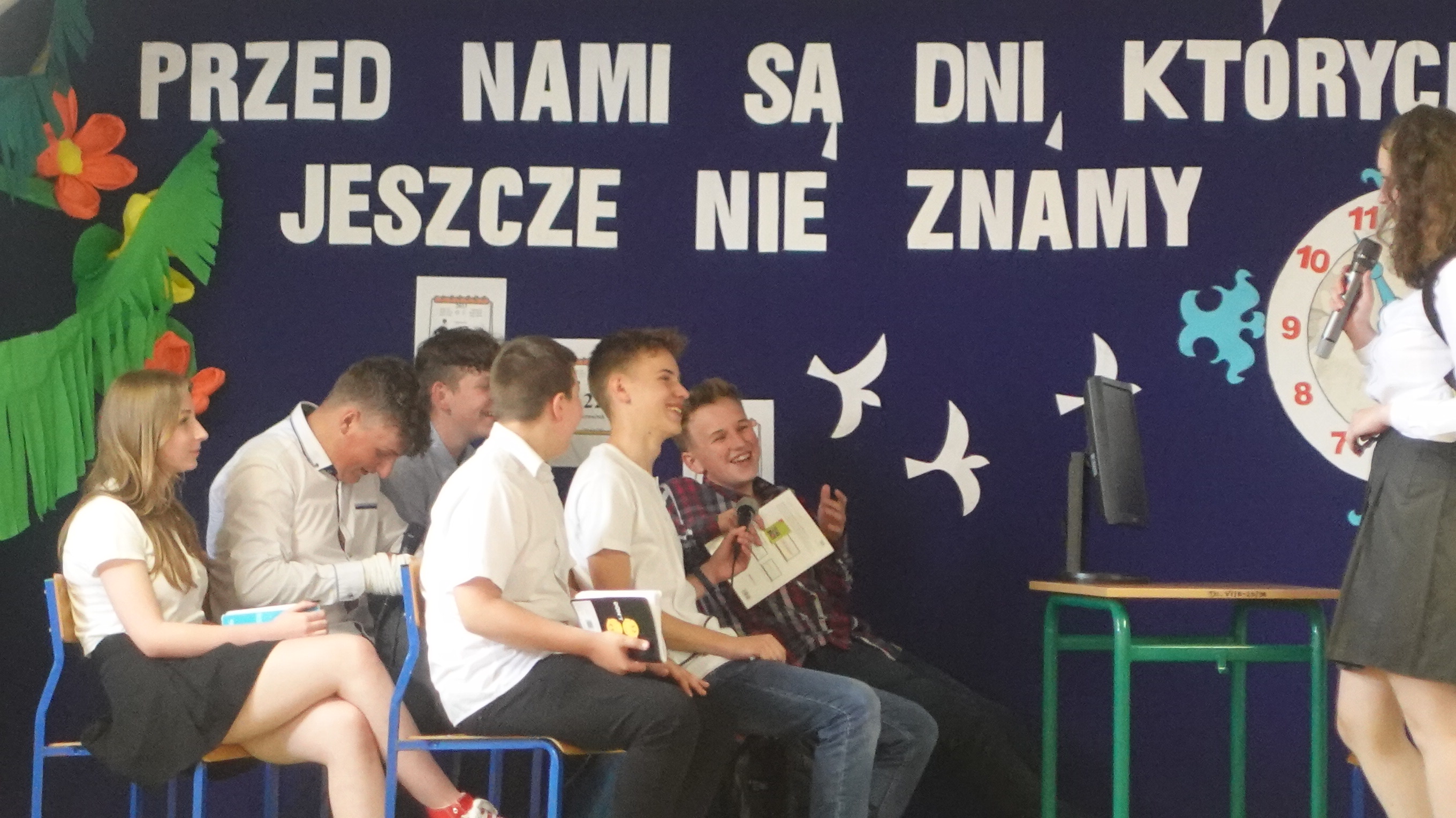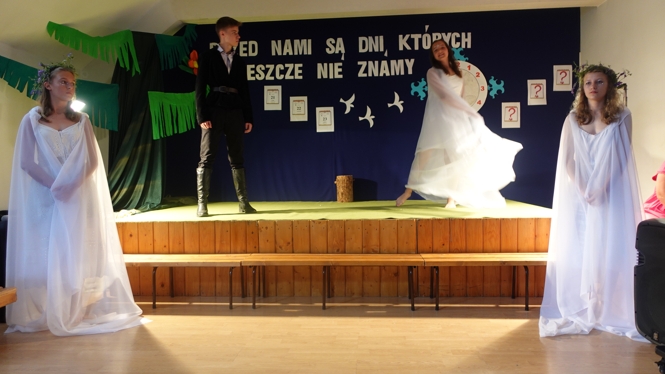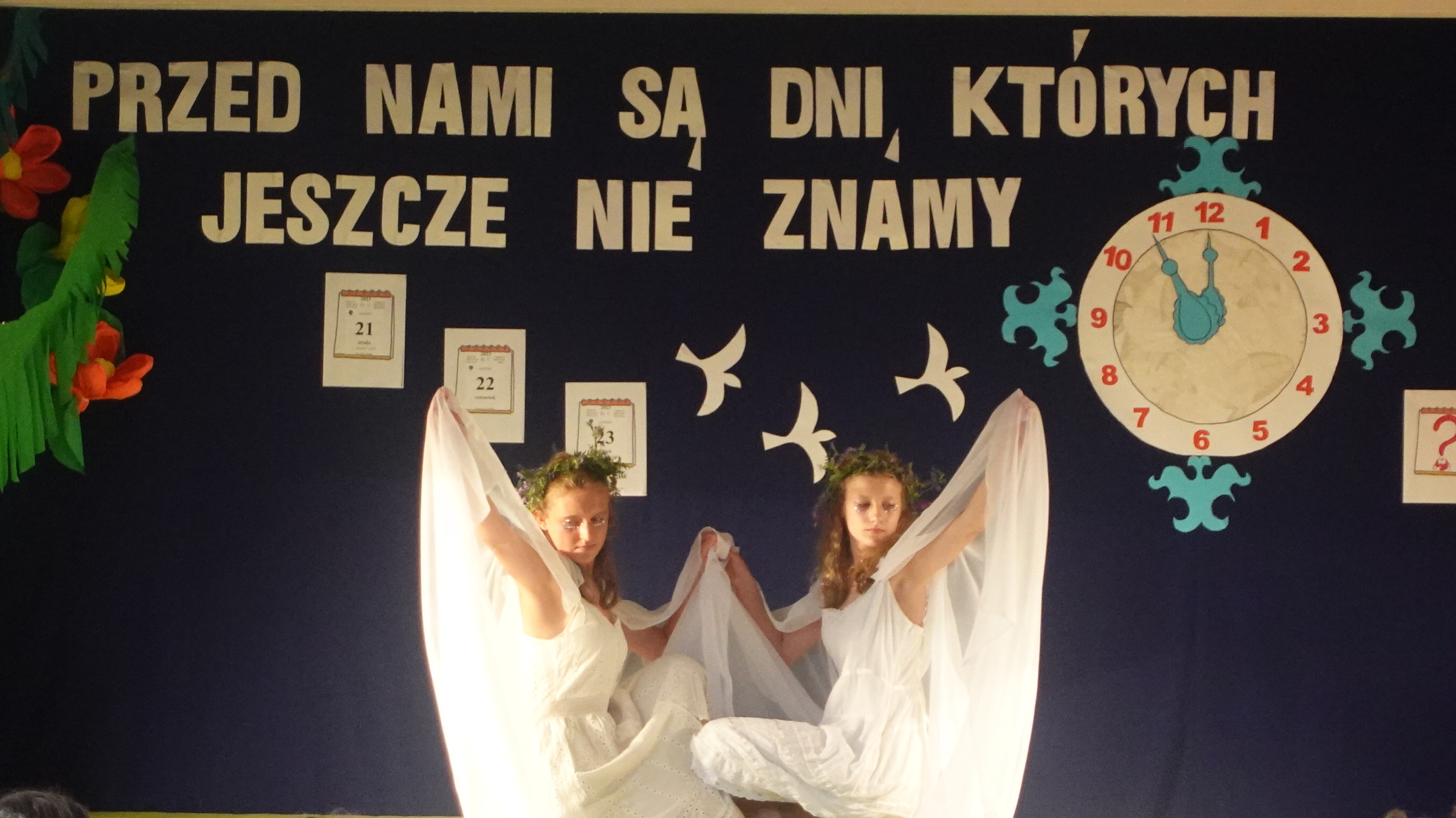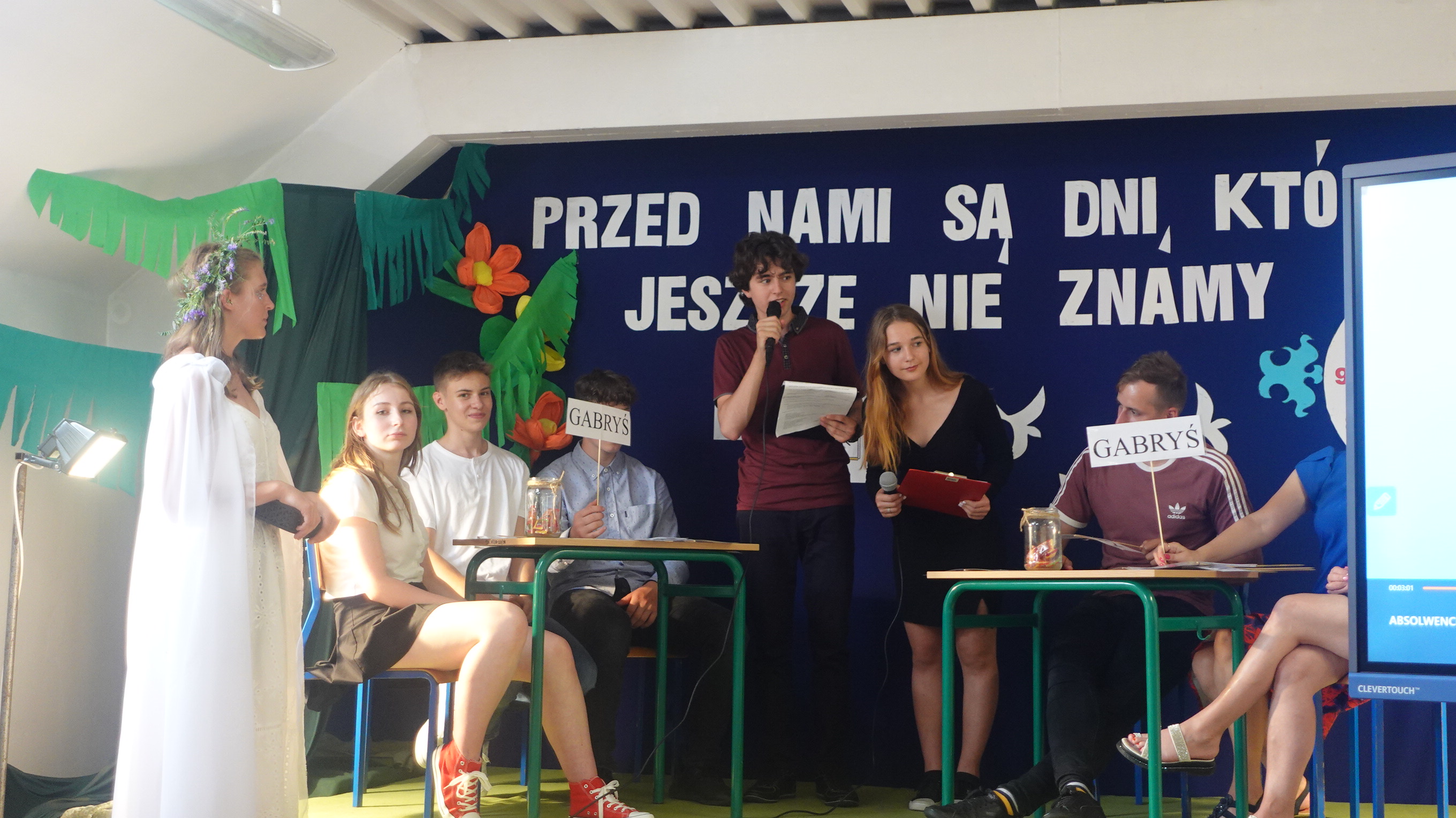 Uroczyste pożegnanie rozpoczęło się od przedstawienia "Świtezianka" w wykonaniu Zosi, Anais, Zuzi i Filipa, pod opieką p. Iwony Bogdał. Po krótkiej przerwie uczniowie kl. 7 z wych. p.Elą Goryczką pożegnali na wesoło starszych kolegów, przeprowadzając "Test wiedzy o ucznich kl.8". W konkurencji brały udział dwie drużyny: nauczycieli i ósmoklasistów.Następnie odchodzący ósmoklasiści wystąpili w skeczu o szkole i swoich nauczycielach oraz podziękowali za 9 lat spędzonych w murach naszej szkoły.