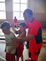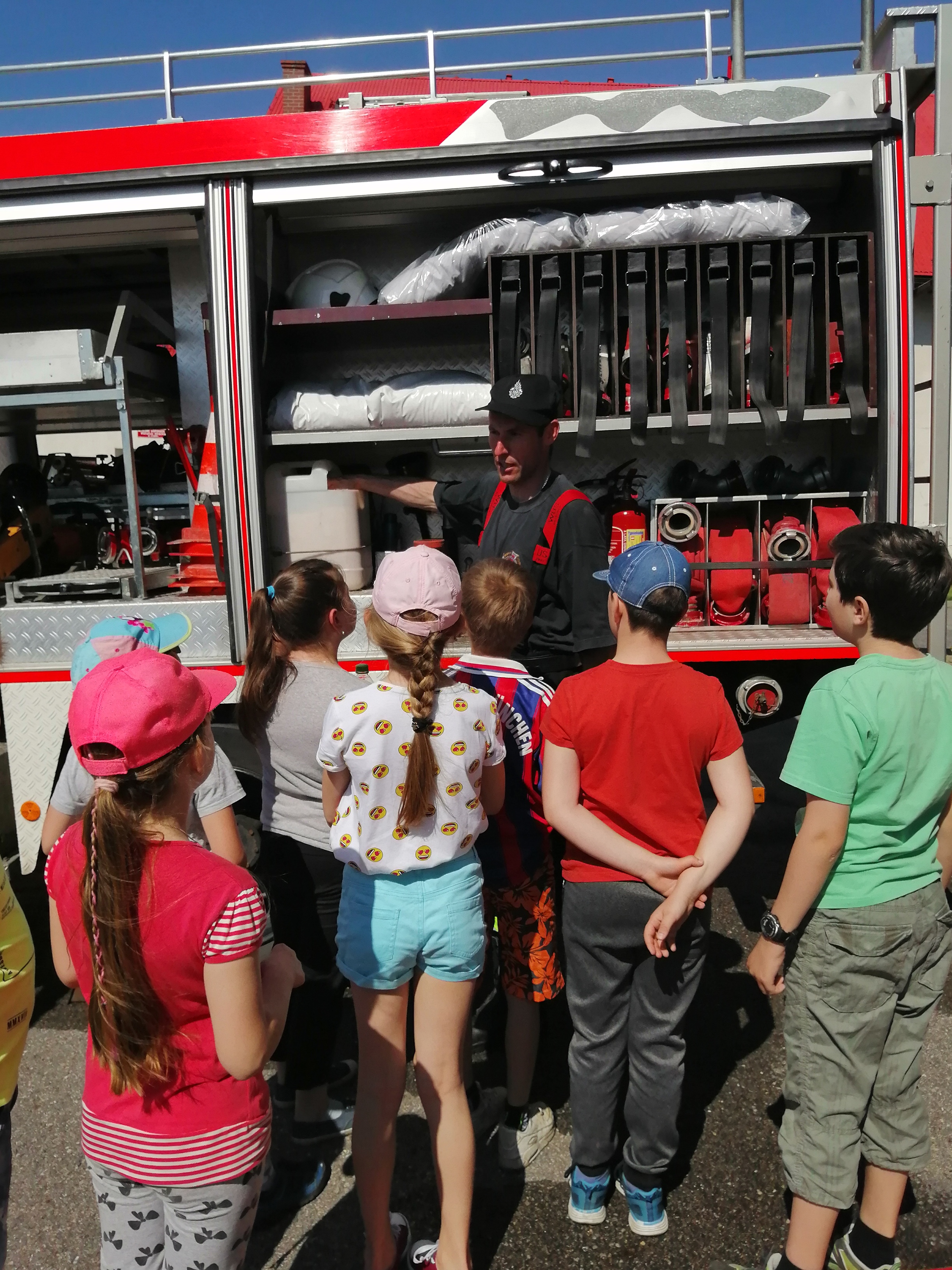 Później zostały przygotowane trzy różne stanowiska, do których uczniowie podchodzili grupami. Przy jednym z nich można było zobaczyć jak wygląda wóz strażacki, założyć strażacki uniform i pompować wodę celując strumieniem w przygotowaną tarczę. Przy drugim uczyliśmy się jak postępować przy drobnych urazach, skaleczeniach i niegroźnych wypadkach. Przy ostatnim stanowisku można było zobaczyć jak prawidłowo udzielić pierwszej pomocy i jak należy zareagować w razie jakiegokolwiek zagrożenia.