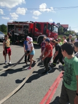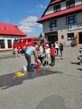 Kiedy wszystkie grupy były już gotowe, uczniowie z naszej szkoły będący w Młodzieżowej Drużynie Pożarniczej zrobili nam pokaz swoich umiejętności. A że pogoda dopisywała, na koniec odbyło się wielkie polewanie...I tak przy piskach i śmiechach zakończył się tegoroczny Dzień Dziecka. Oczywiście w przerwie były pyszne pączki (te które ocalały), a na zakończenie pieczona kiełbaska.