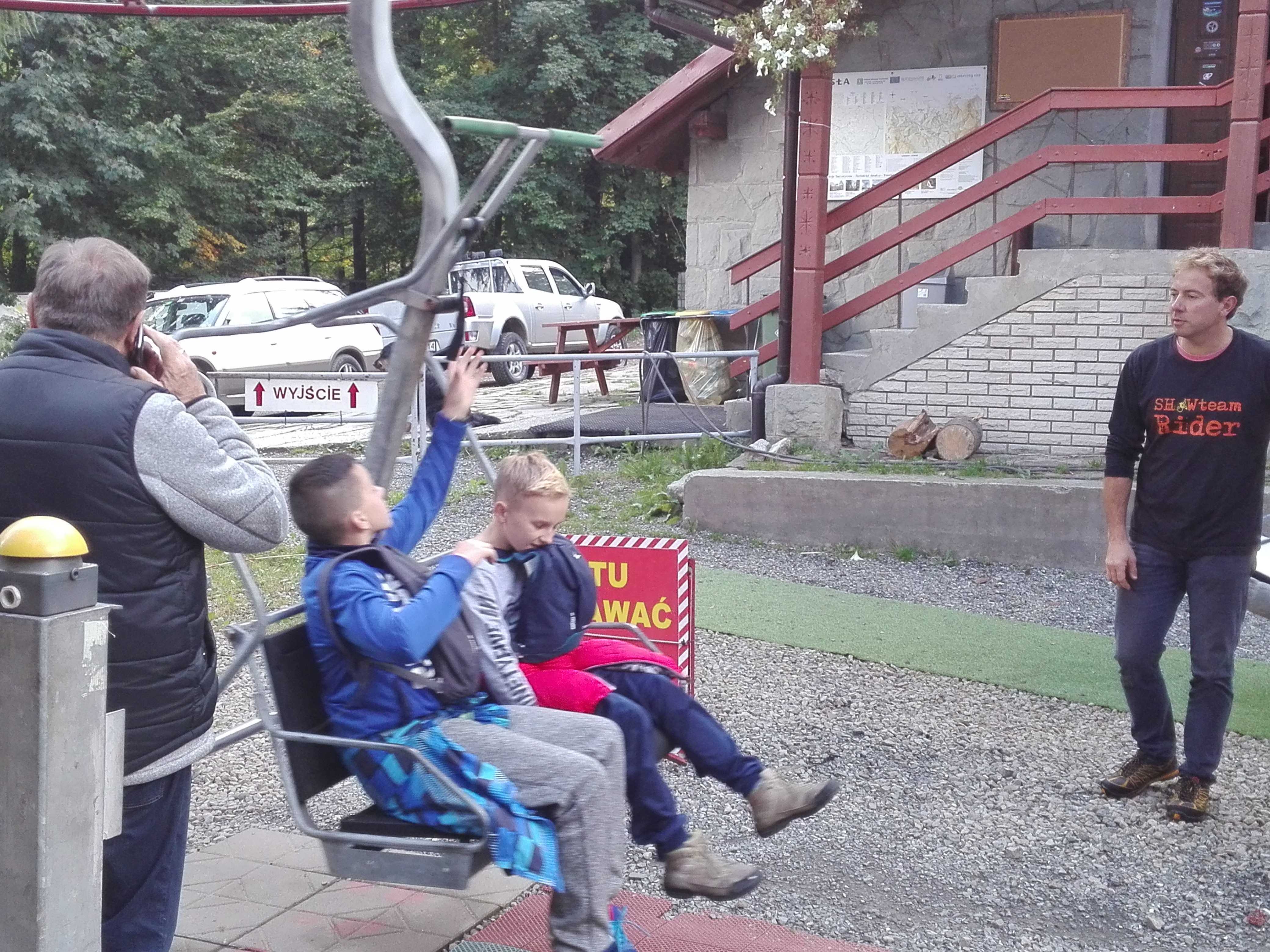 Do wyciągu doszliśmy w samą porę, obsługa już na nas czekała i po uregulowaniu spraw finansowych, kolejka ruszyła. Ustawiliśmy się w pary: starsze dziewczyny z młodszymi uczniami, ci co się bali, z tymi odważniejszymi i tak powolutku wszyscy dostaliśmy się na górę. Trasa, choć dosyć krótka, dla niektórych okazała się dużym wyzwaniem, kiedy trzeba było opanować własny niepokój a czasem i lęk.