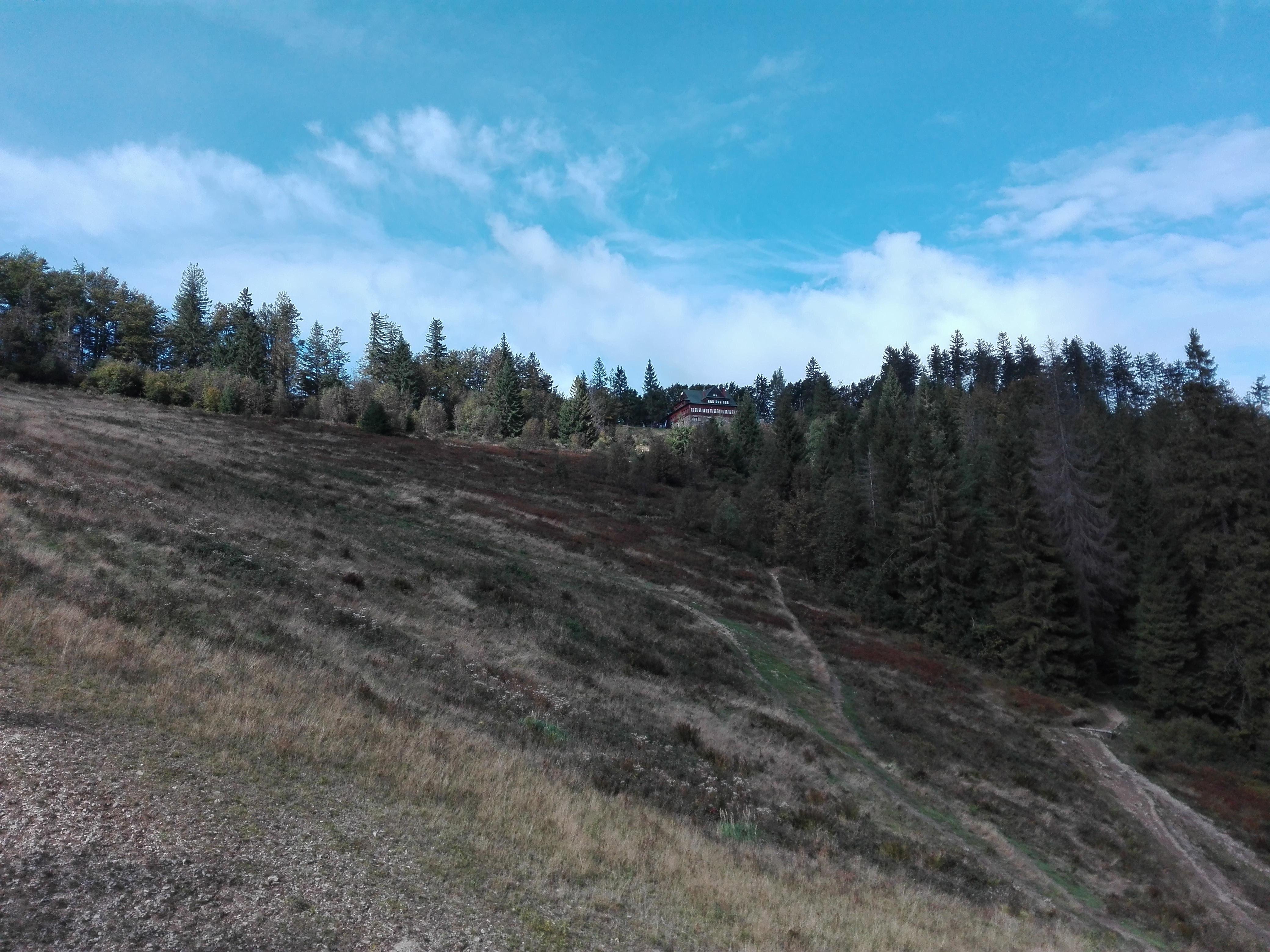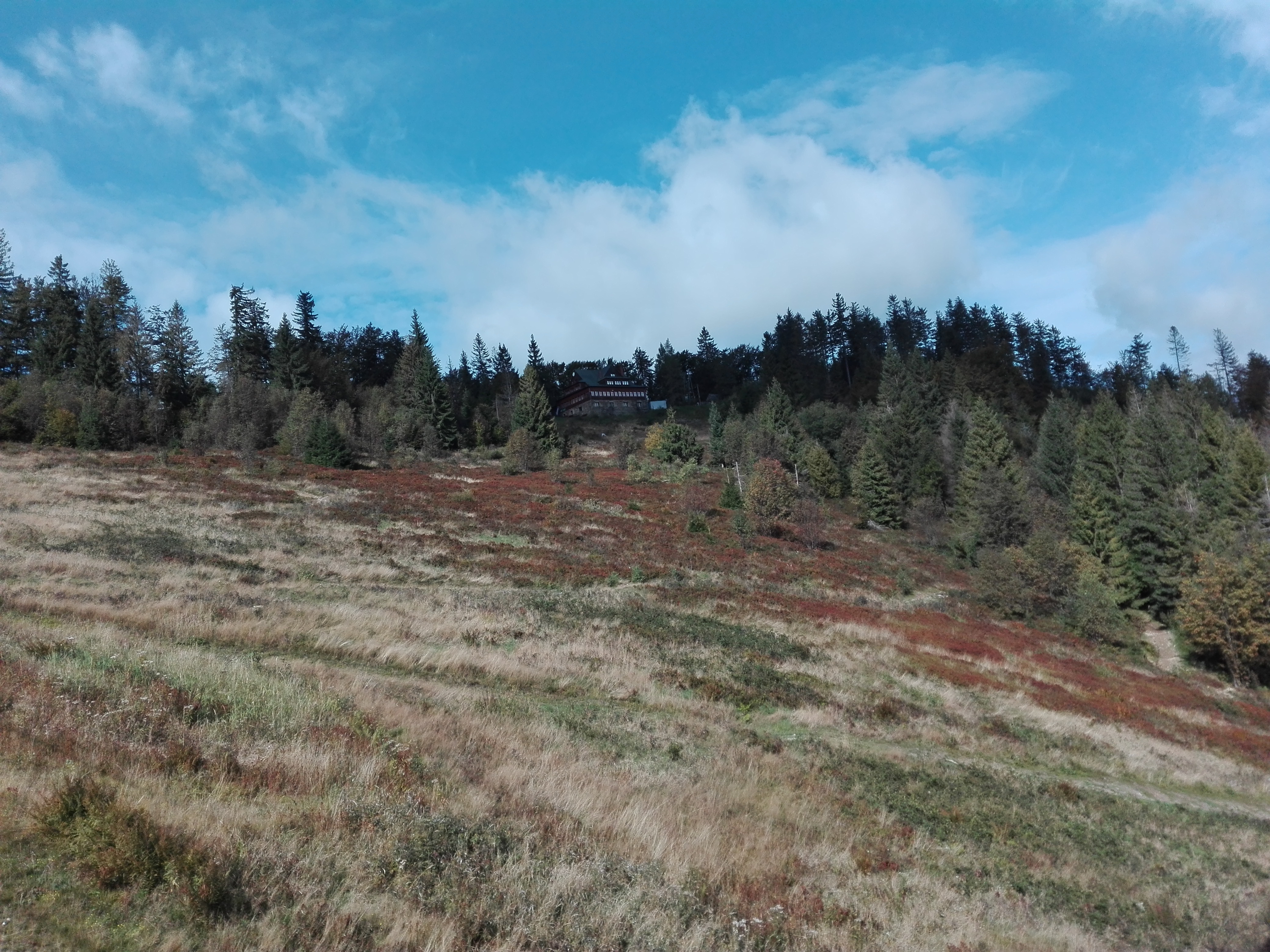 Na samym szczycie odsłoniły się nam przepiękne, jesienne widoki, pogoda sprzyjała a malownicze stare, górskie schronisko zapraszało do wejścia. Powodzeniem cieszyły się w nim oczywiście pamiątkowe magnesy i breloczki oraz...gorąca czekolada. Na zewnątrz panował chłód a w środku było naprawdę ciepło i przyjemnie. Kiedy już „oblężenie" tego budynku zostało zakończone i coraz więcej osób zaczęło pytać o drogę powrotną, zebraliśmy się do wyjścia. Niebo w tym czasie niebezpiecznie się zachmurzyło, więc zrobiliśmy tylko kilka pamiątkowych zdjęć i ruszyliśmy powrotnym szlakiem w stronę Istebnej.