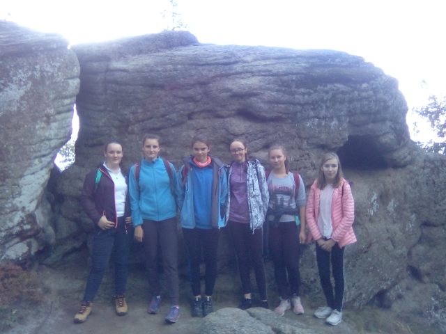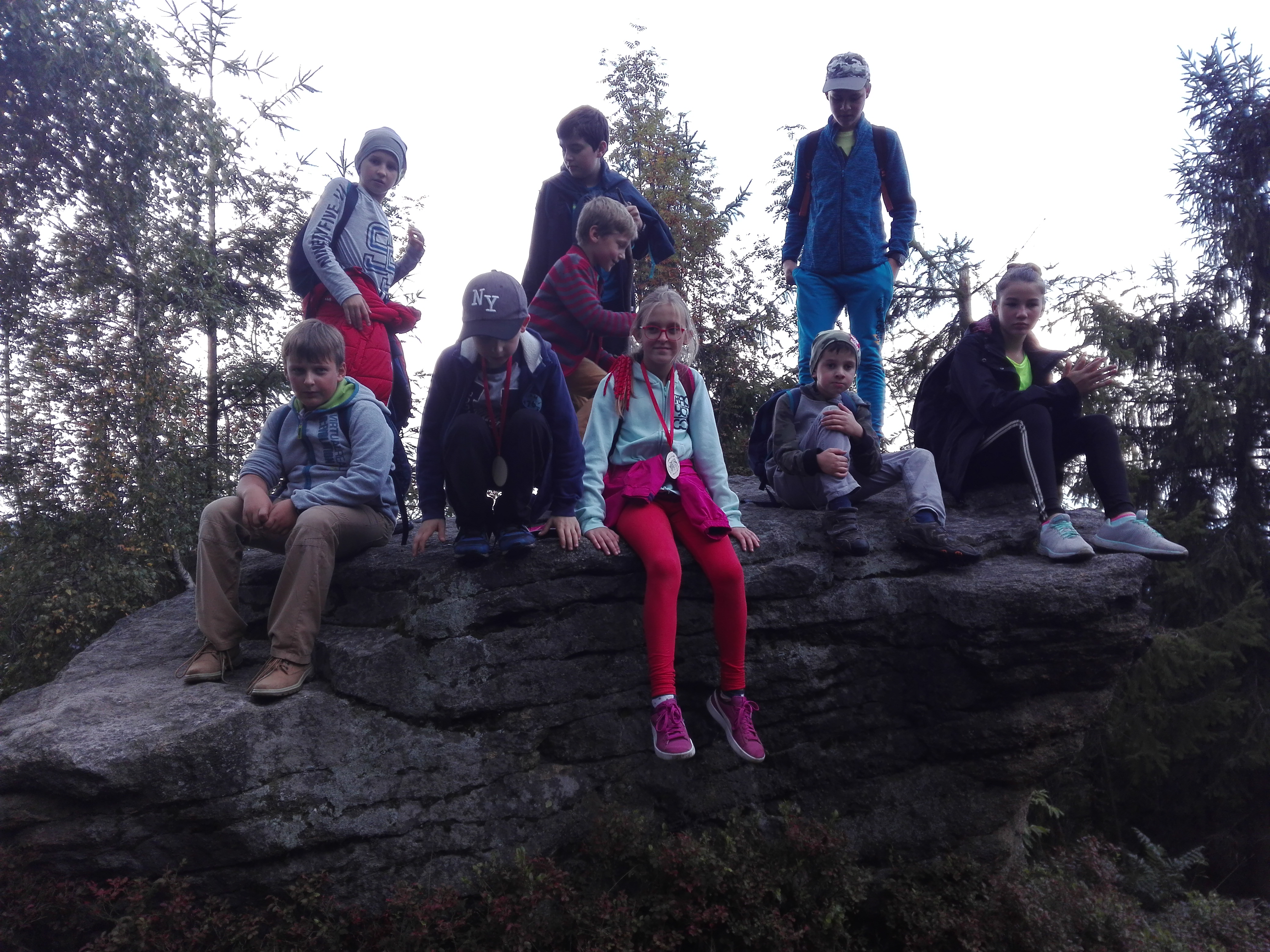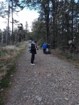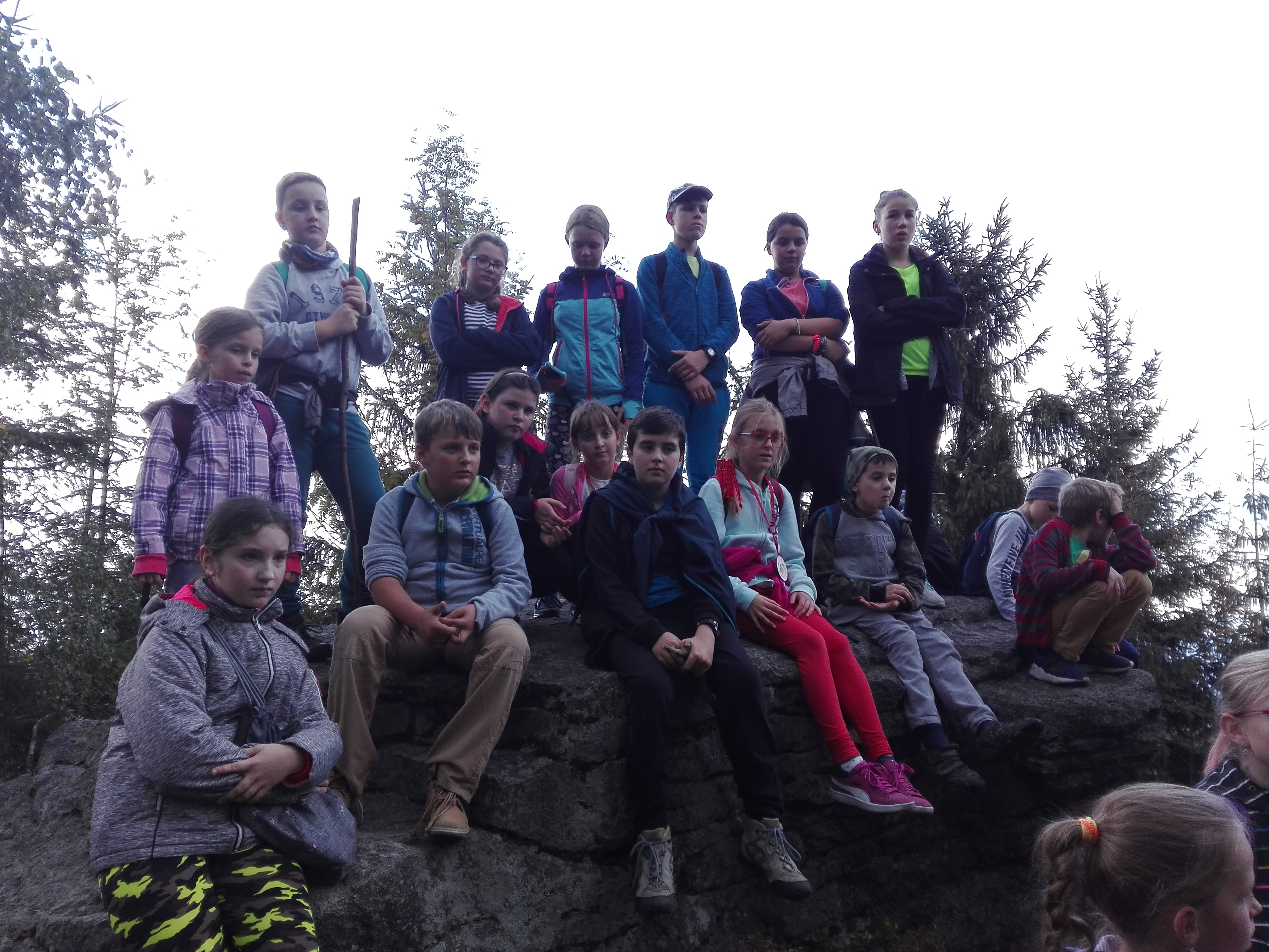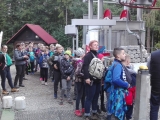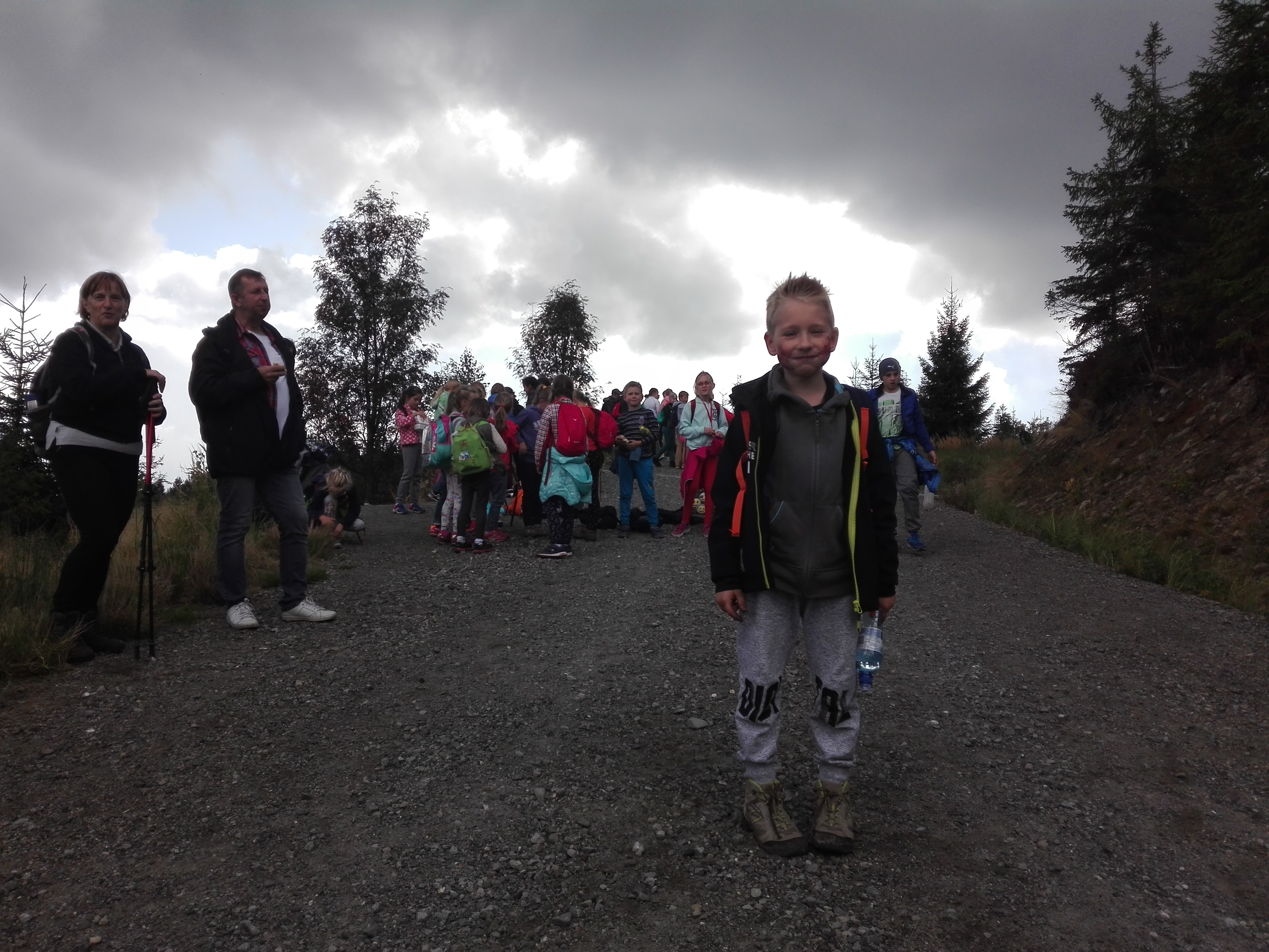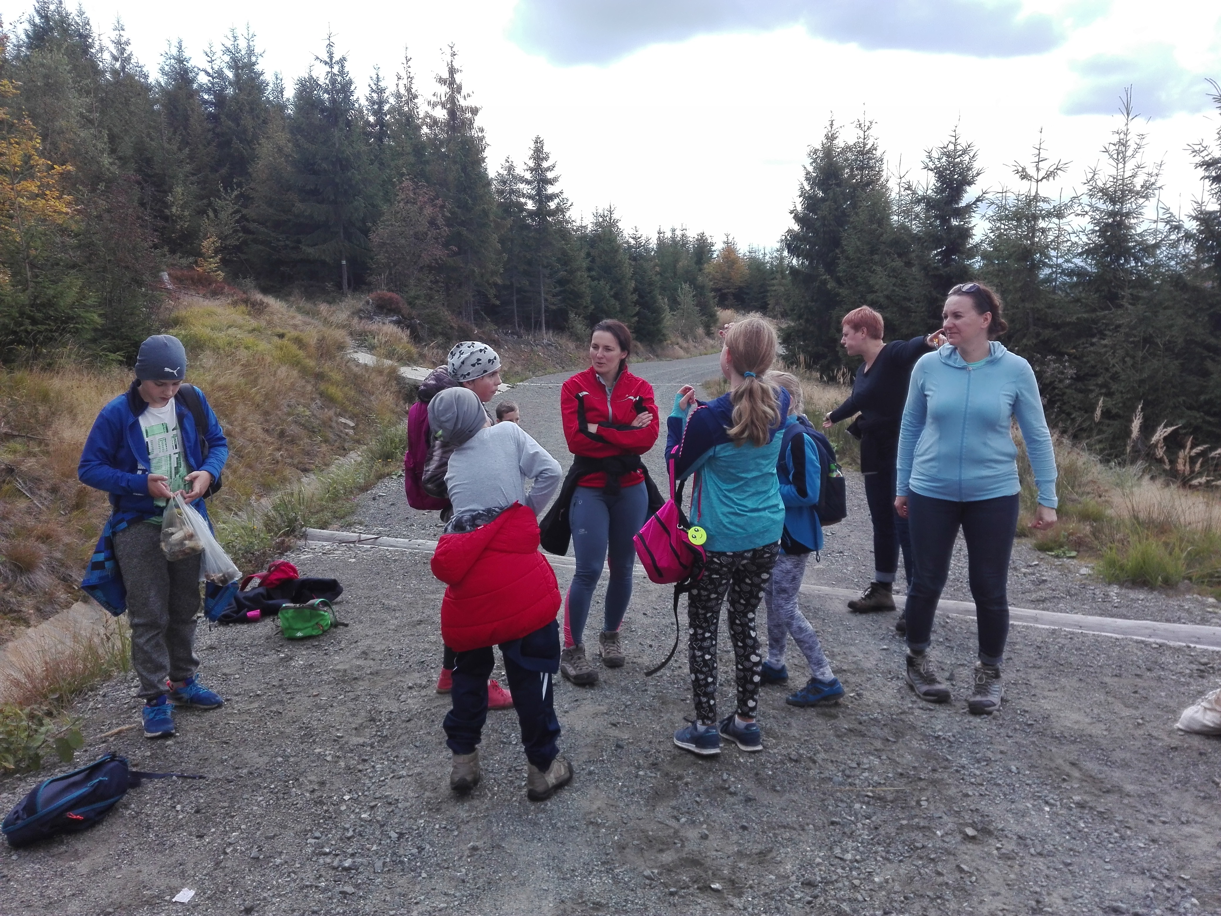 Schodziliśmy ze Stożka klasami zaczynając znów od tych najmłodszych. Pani Anna Dziewior zerkała na poczynania klasy 6, a na końcu pod moim okiem „starszyzna" czyli 7 i 8, która przez wieloletnie łączenie właściwie zawsze trzyma się razem. Peleton zamykał p. Dariusz Pawełek wędrując z sękatym kosturem i jak pasterz zgarniając pozostające na tyłach „owieczki" ...szukające grzybów i borówek. Umazani na fioletowo – a było od czego, z workami grzybów – wysyp nadal trwał, a niektórzy z odciskami na nogach, dotarliśmy wreszcie do Istebnej Bucznika.