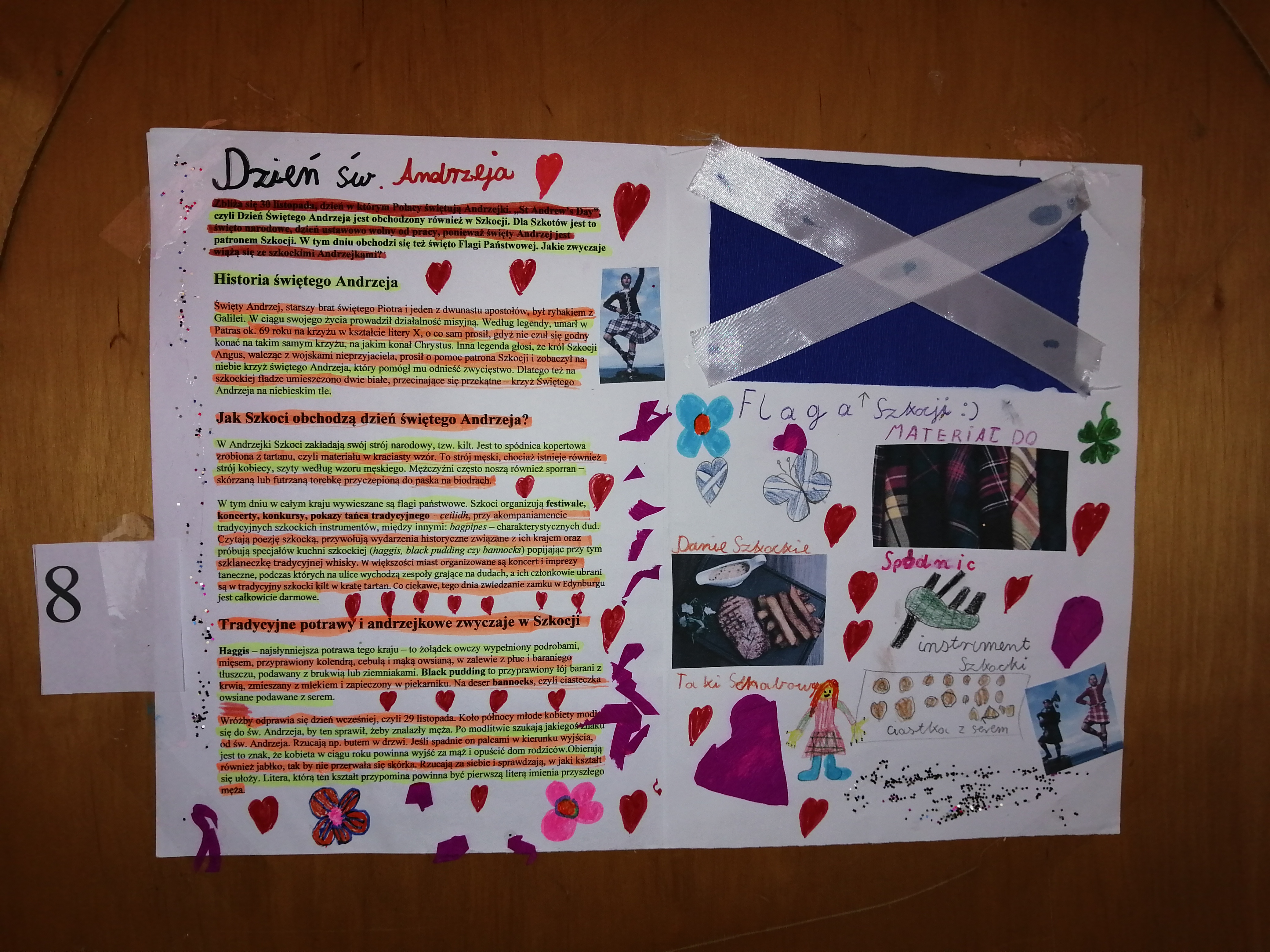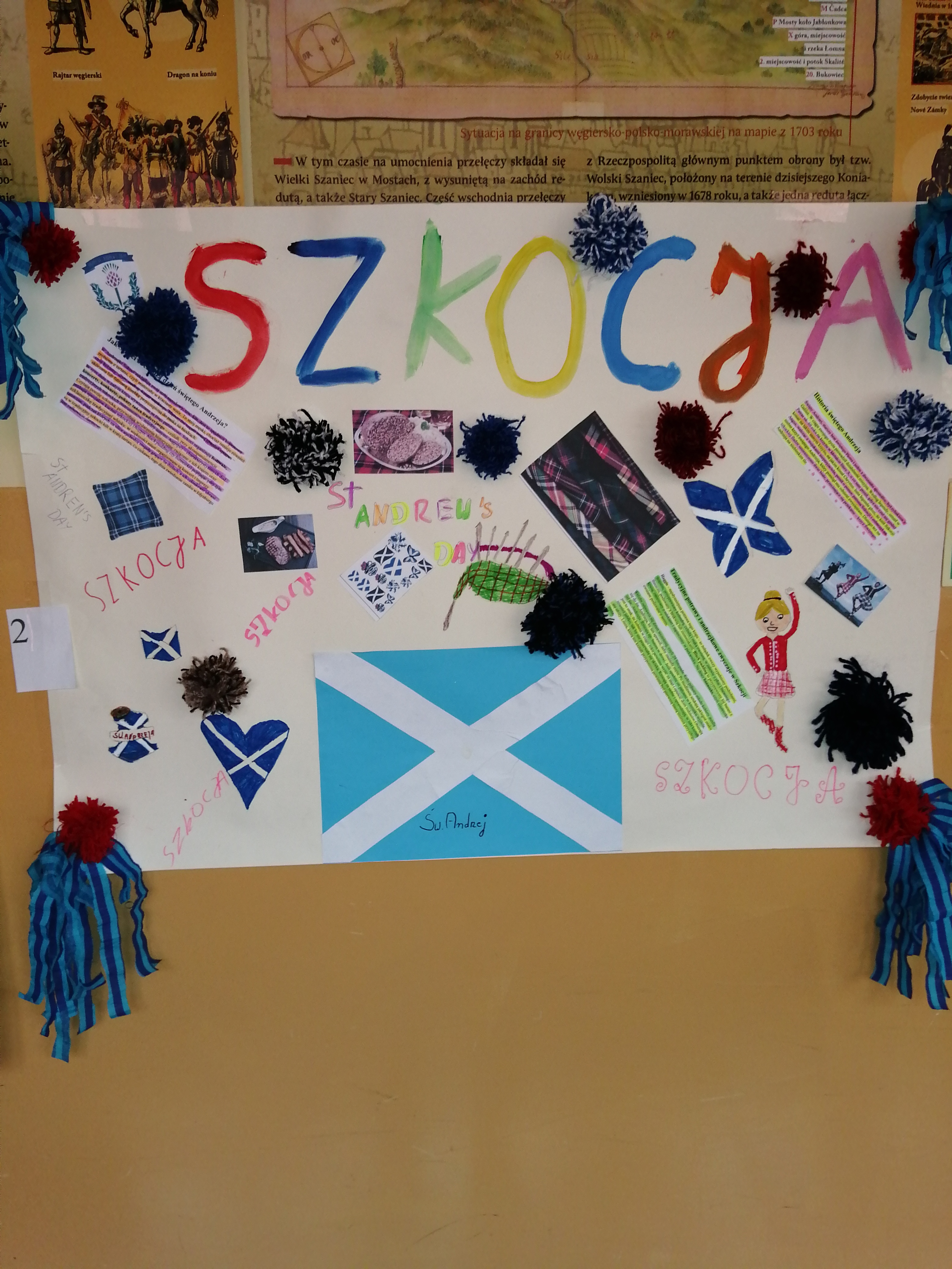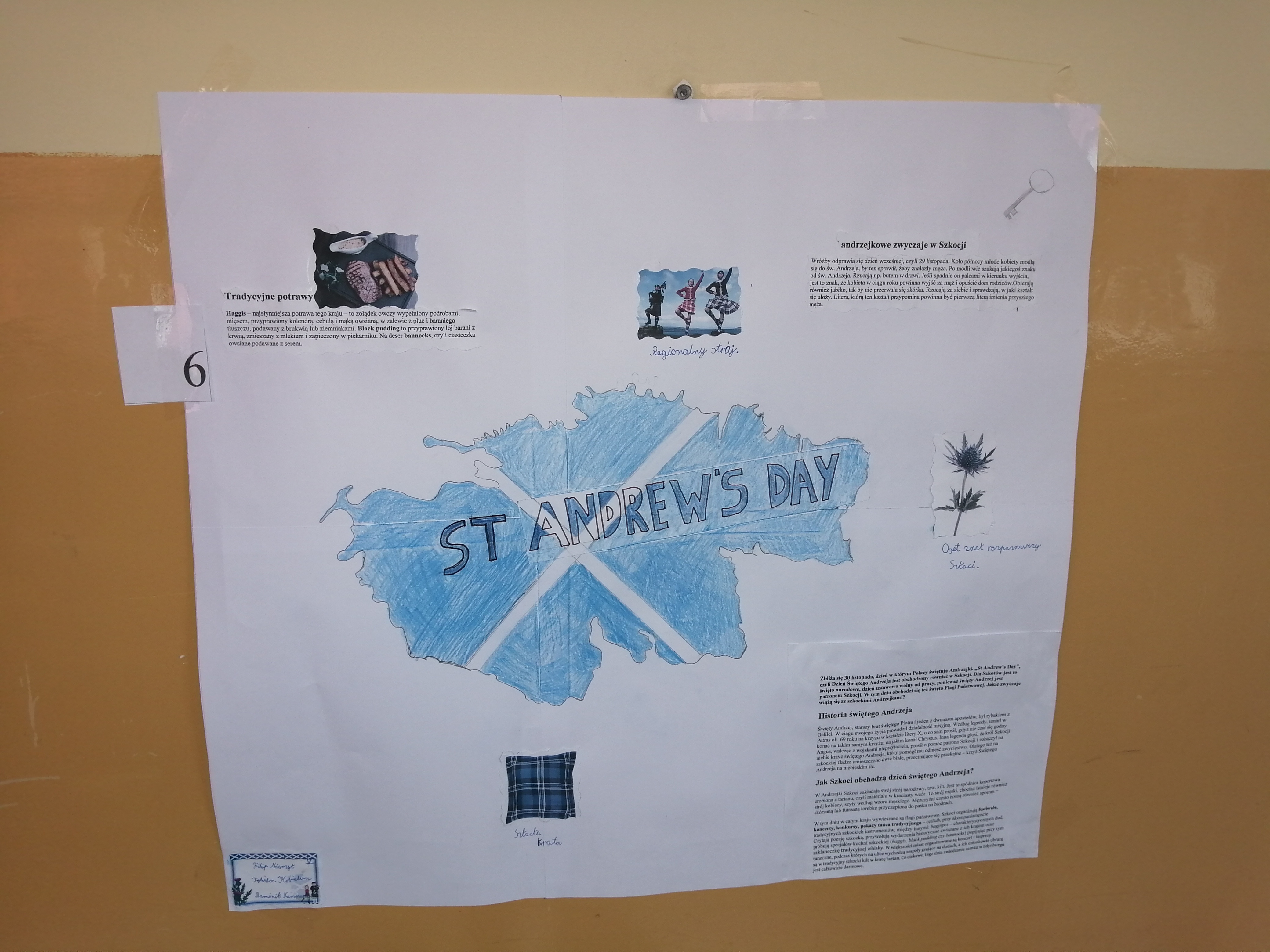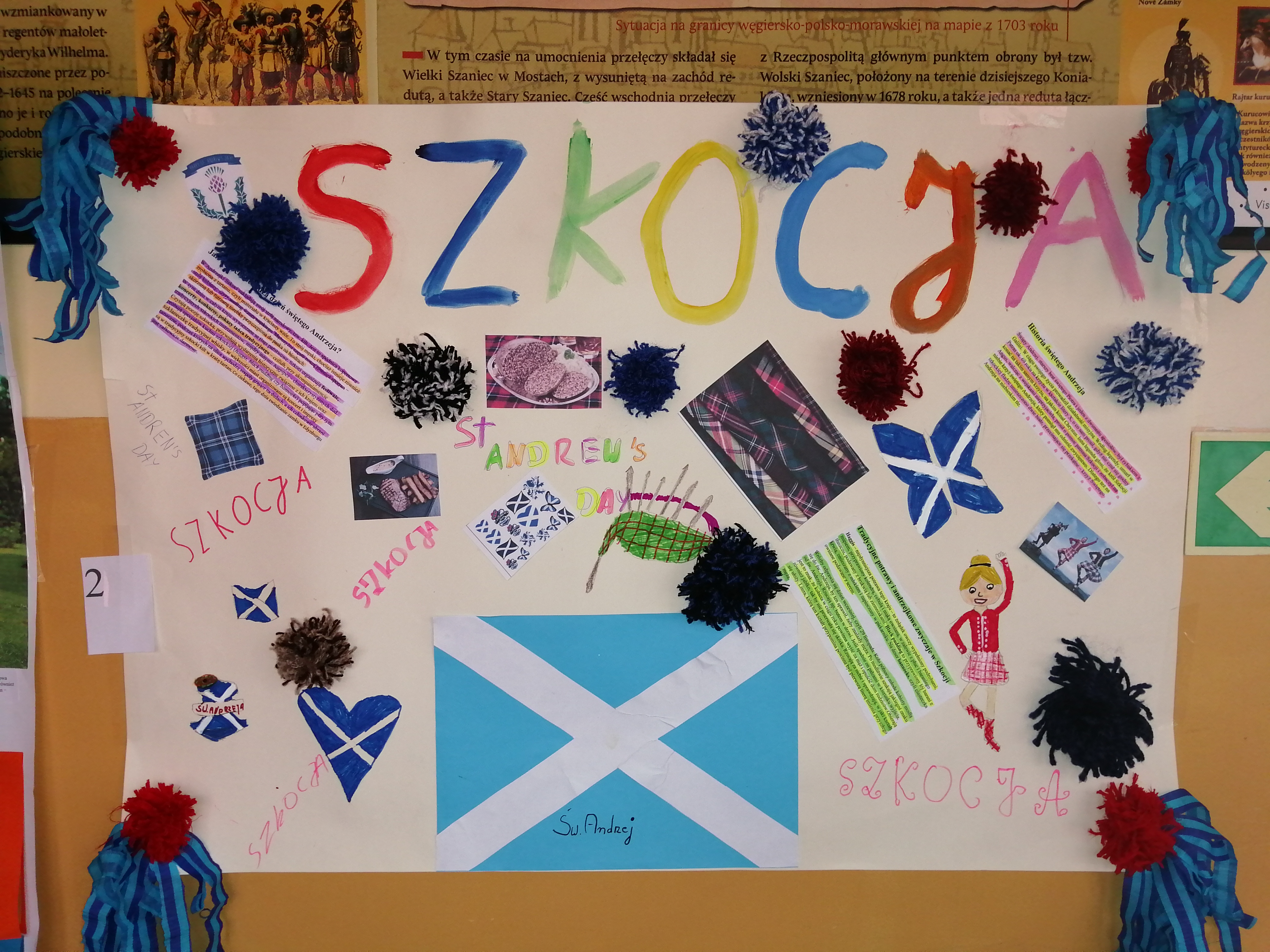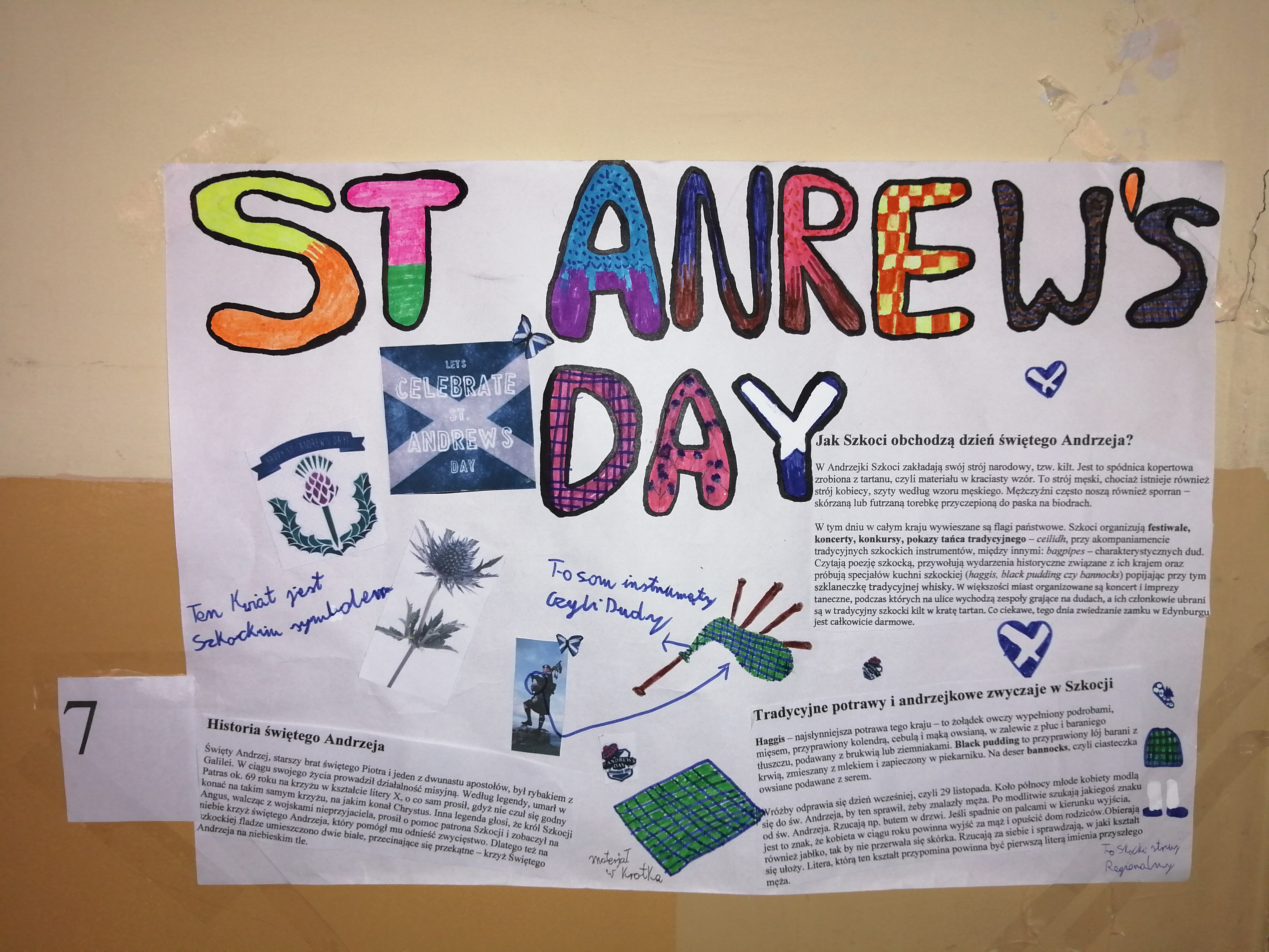 Na zajęciach zaznajamiali uczniów z historią, geografią, kulturą i zwyczajami panującymi w tym kraju. Efektem tego były plakaty przygotowane przez kilkuosobowe grupy uczniów. Zostały one wywieszone na szkolnym korytarzu w przeddzień obchodów tego święta. 28 listopada na korytarzach zrobiło się więc niebiesko od ubrań nawiązujących do kolorów szkockiej flagi. Ze szkolnych sal słychać było dźwięki szkockiej muzyki a po salach chodzili trzej uczniowie z klasy 5. składając życzenia, częstując cukierkami (oczywiście w niebieskich papierkach) i rozdając obrazki z wizerunkiem św. Andrzeja. Odbył się też konkurs wiedzy dotyczący Szkocji, do którego zgłosili się uczniowie ze starszych klas. Były to pytania, zagadki i quizy przeprowadzone przy wykorzystaniu nowoczesnej aplikacji KAHOOT. Nauczyciele ciężko zastanawiali się nad obiektywną oceną przygotowanych plakatów. Jedne można by docenić za staranność i estetykę, inne za barwy, jeszcze inne za pomysłowość i oryginalność, wreszcie też za zasób informacji, które zostały zawarte. Na pewno w każdy z nich uczniowie włożyli sporo pracy i werdykt wcale nie był taki łatwy do ustalenia.