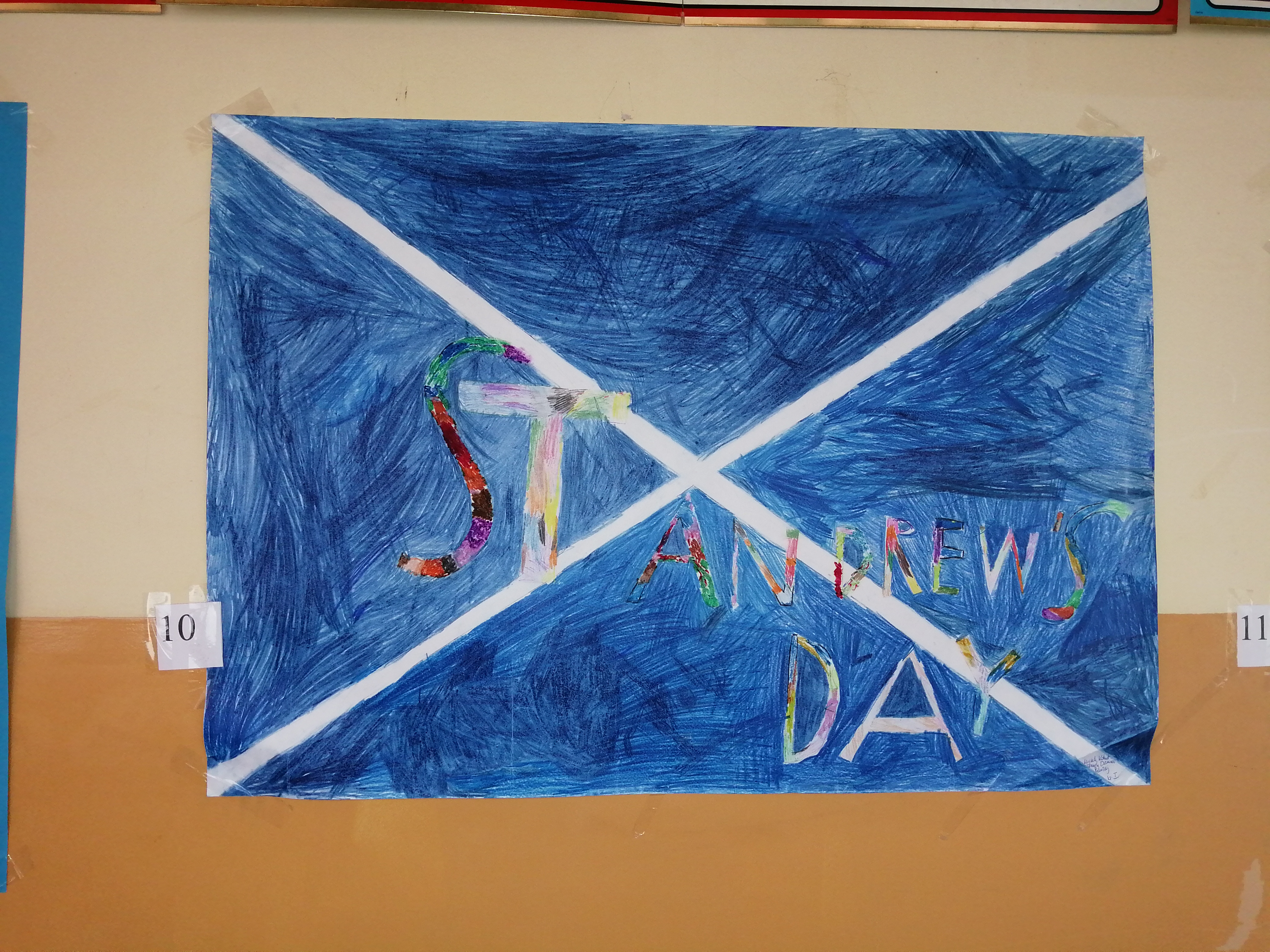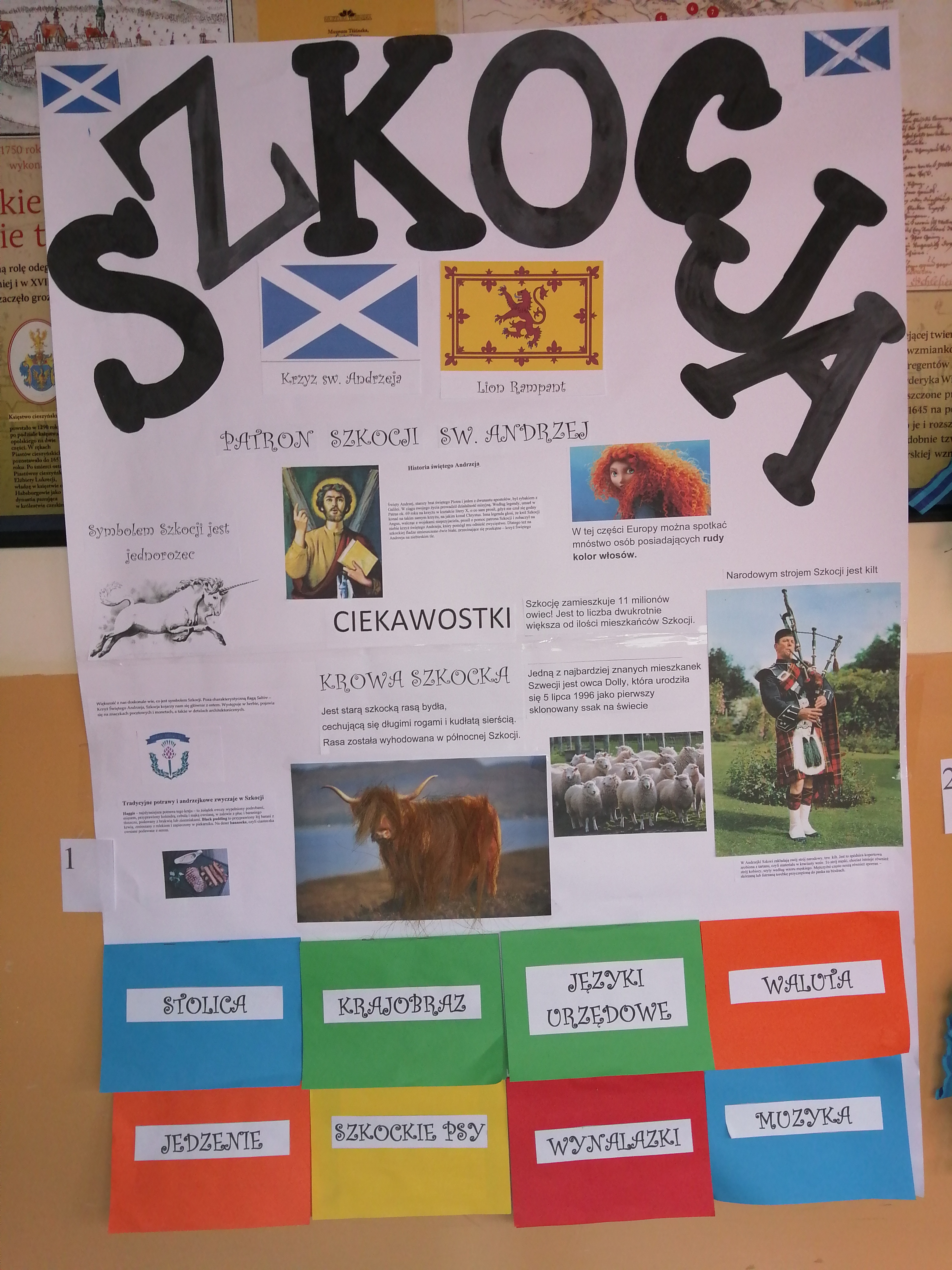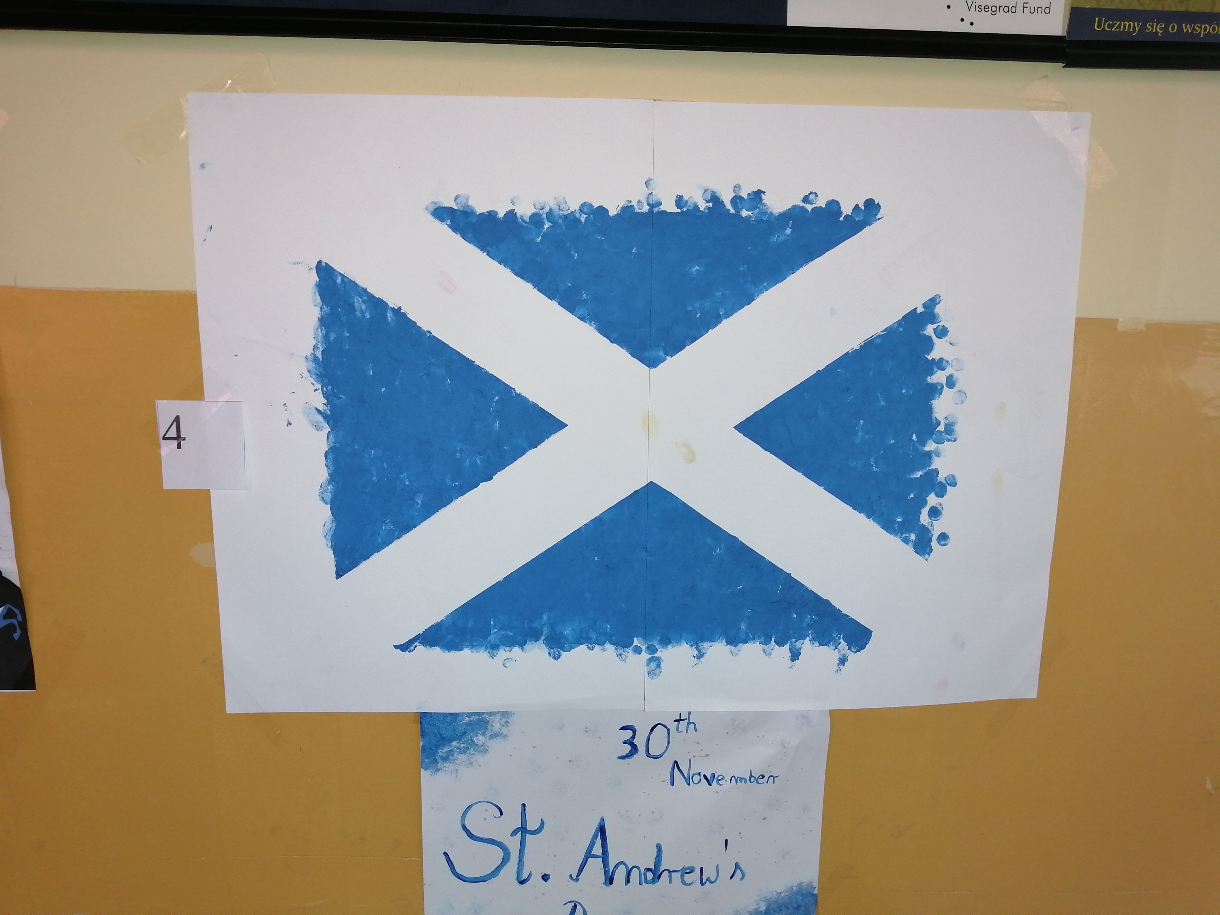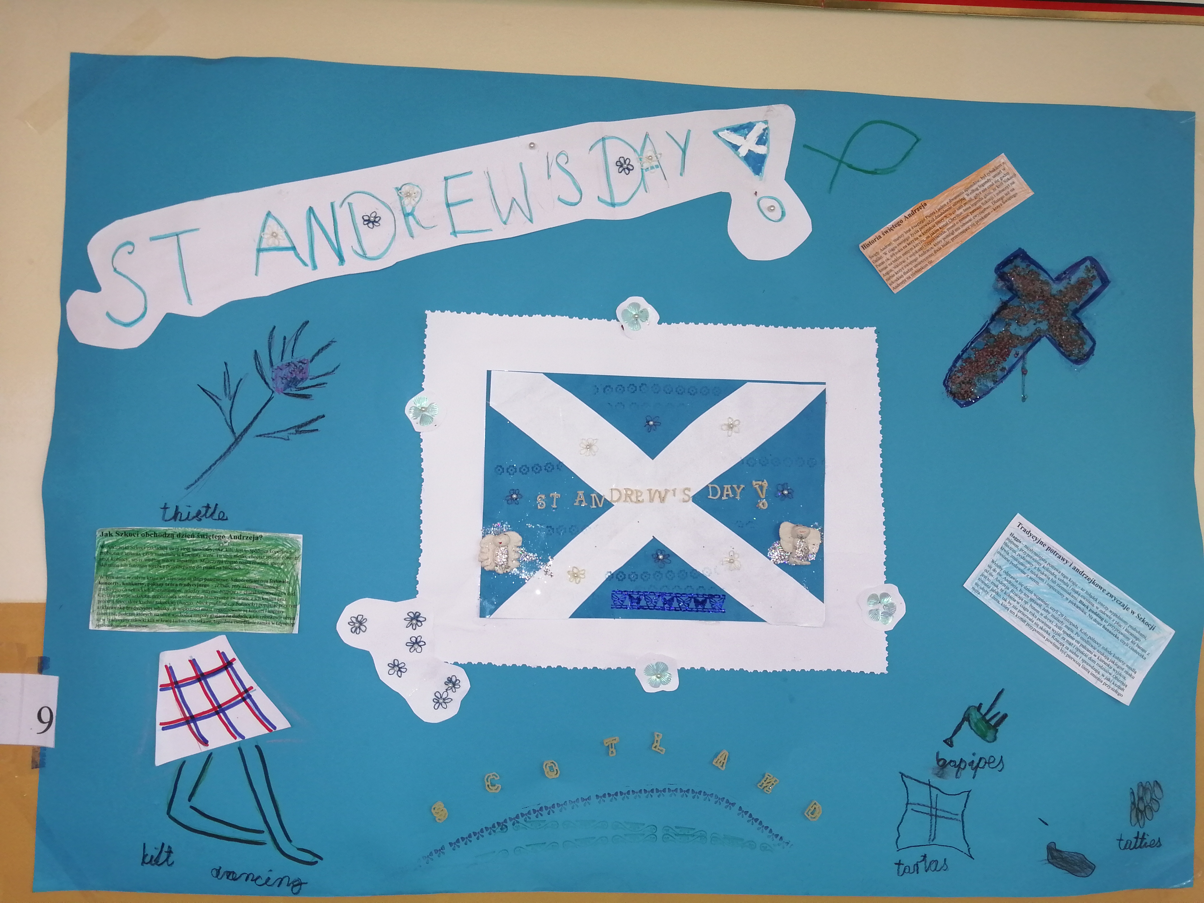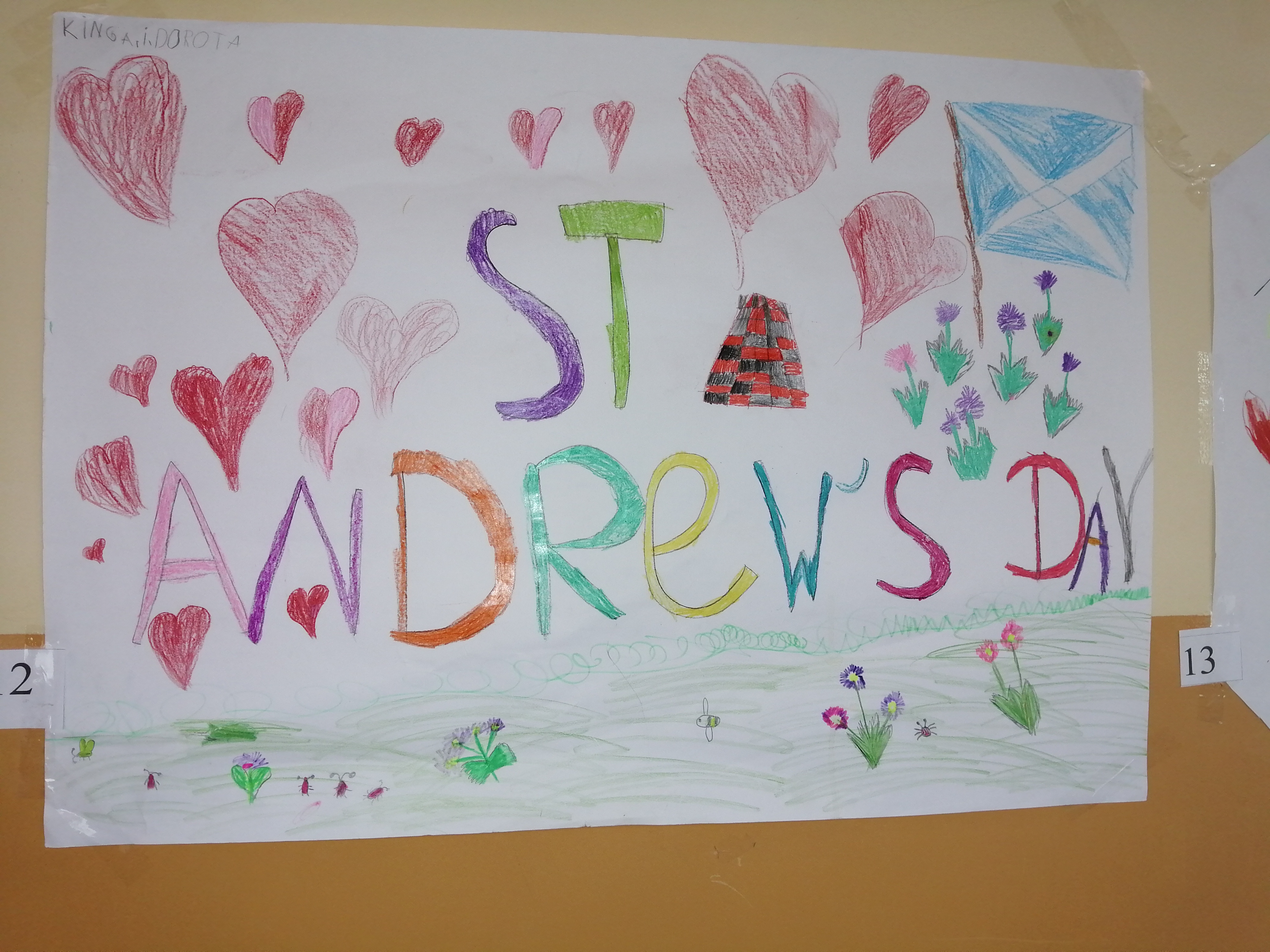 Na zajęciach zaznajamiali uczniów z historią, geografią, kulturą i zwyczajami panującymi w tym kraju. Efektem tego były plakaty przygotowane przez kilkuosobowe grupy uczniów. Zostały one wywieszone na szkolnym korytarzu w przeddzień obchodów tego święta. 28 listopada na korytarzach zrobiło się więc niebiesko od ubrań nawiązujących do kolorów szkockiej flagi. Ze szkolnych sal słychać było dźwięki szkockiej muzyki a po salach chodzili trzej uczniowie z klasy 5. składając życzenia, częstując cukierkami (oczywiście w niebieskich papierkach) i rozdając obrazki z wizerunkiem św. Andrzeja. Odbył się też konkurs wiedzy dotyczący Szkocji, do którego zgłosili się uczniowie ze starszych klas. Były to pytania, zagadki i quizy przeprowadzone przy wykorzystaniu nowoczesnej aplikacji KAHOOT. Nauczyciele ciężko zastanawiali się nad obiektywną oceną przygotowanych plakatów. Jedne można by docenić za staranność i estetykę, inne za barwy, jeszcze inne za pomysłowość i oryginalność, wreszcie też za zasób informacji, które zostały zawarte. Na pewno w każdy z nich uczniowie włożyli sporo pracy i werdykt wcale nie był taki łatwy do ustalenia.