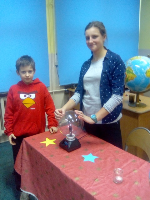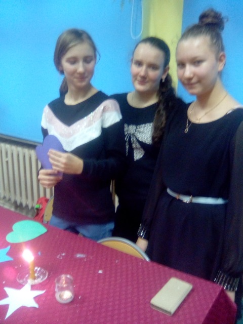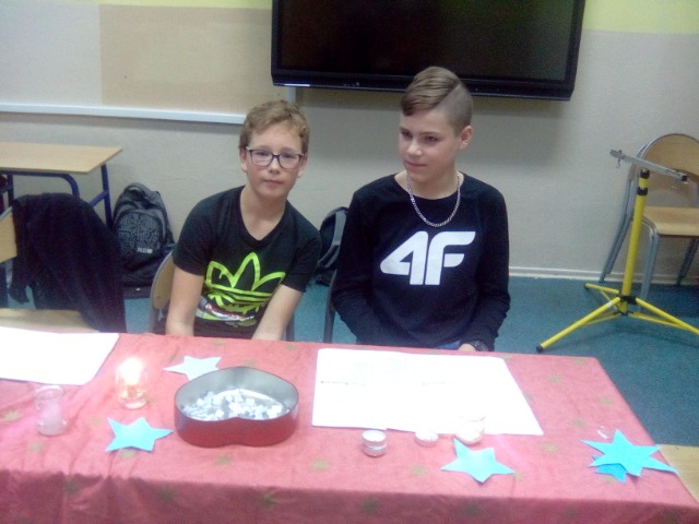 Każda klasa przychodziła ze swoim opiekunem, żeby sobie powróżyć. Był więc koszyk pełen cukierków z wróżbami, były tradycyjne serduszka z imionami chłopców i dziewcząt, które trzeba było przebić szpilką, pojawiła się też wróżba z trzema kubkami dotycząca życiowych wyborów. Z globusa można było odczytać, dokąd będziemy podróżować, a z losowanych karteczek poznać jaki zawód nam przeznaczony. Nawet jedna z „wróżek" próbowała odczytać przyszłość, za pomocą magicznej kuli...Oczywiście wszystko należało potraktować z przymrużeniem oka... Magiczna sala podobała się szczególnie tym najmłodszym, dla których była to zupełna niespodzianka. Chciałabym pochwalić obie klasy, ponieważ bardzo dobrze się przygotowały i miło było patrzeć z jakim zaangażowaniem zajmują się właśnie tymi młodszymi uczniami.