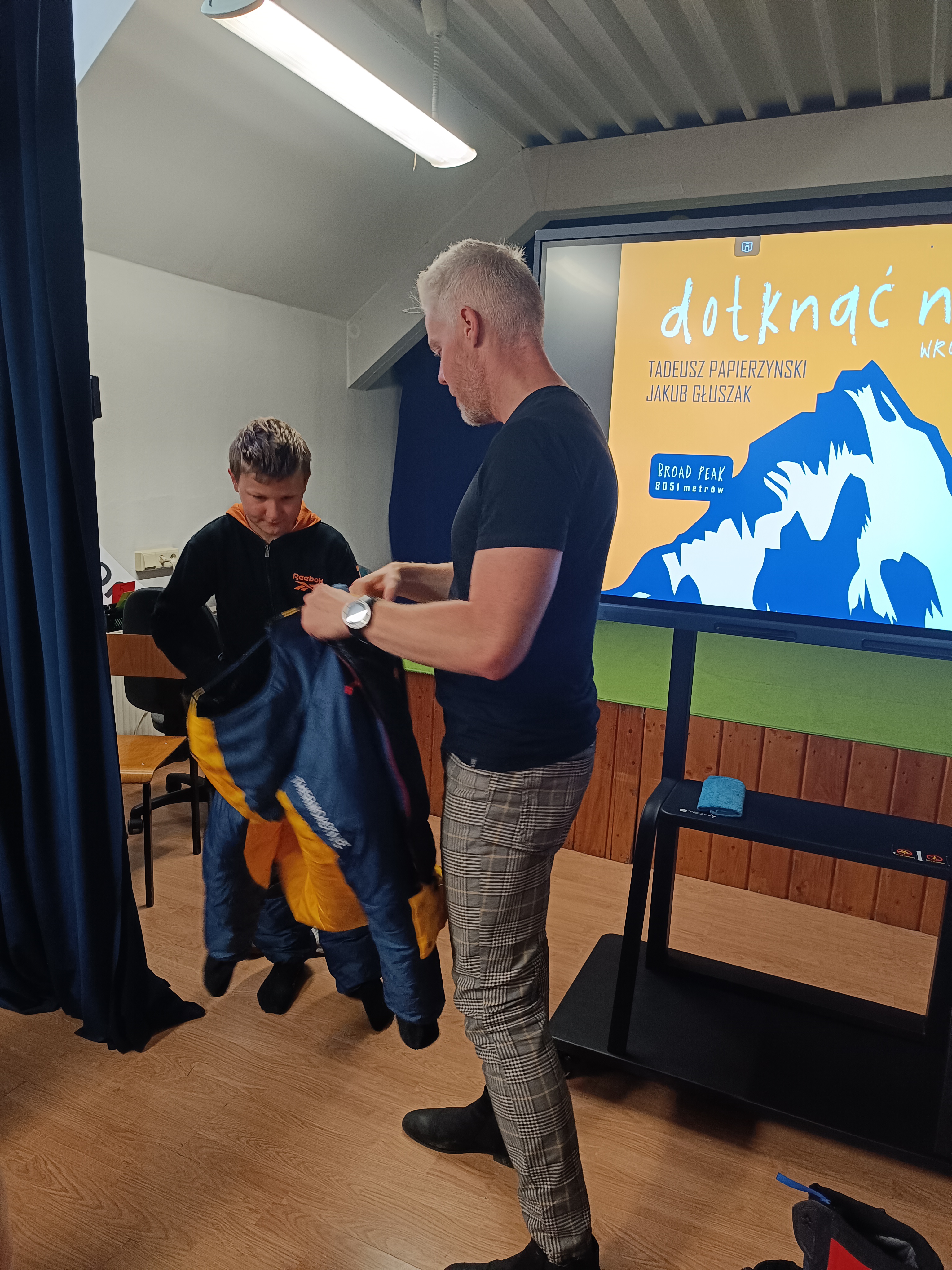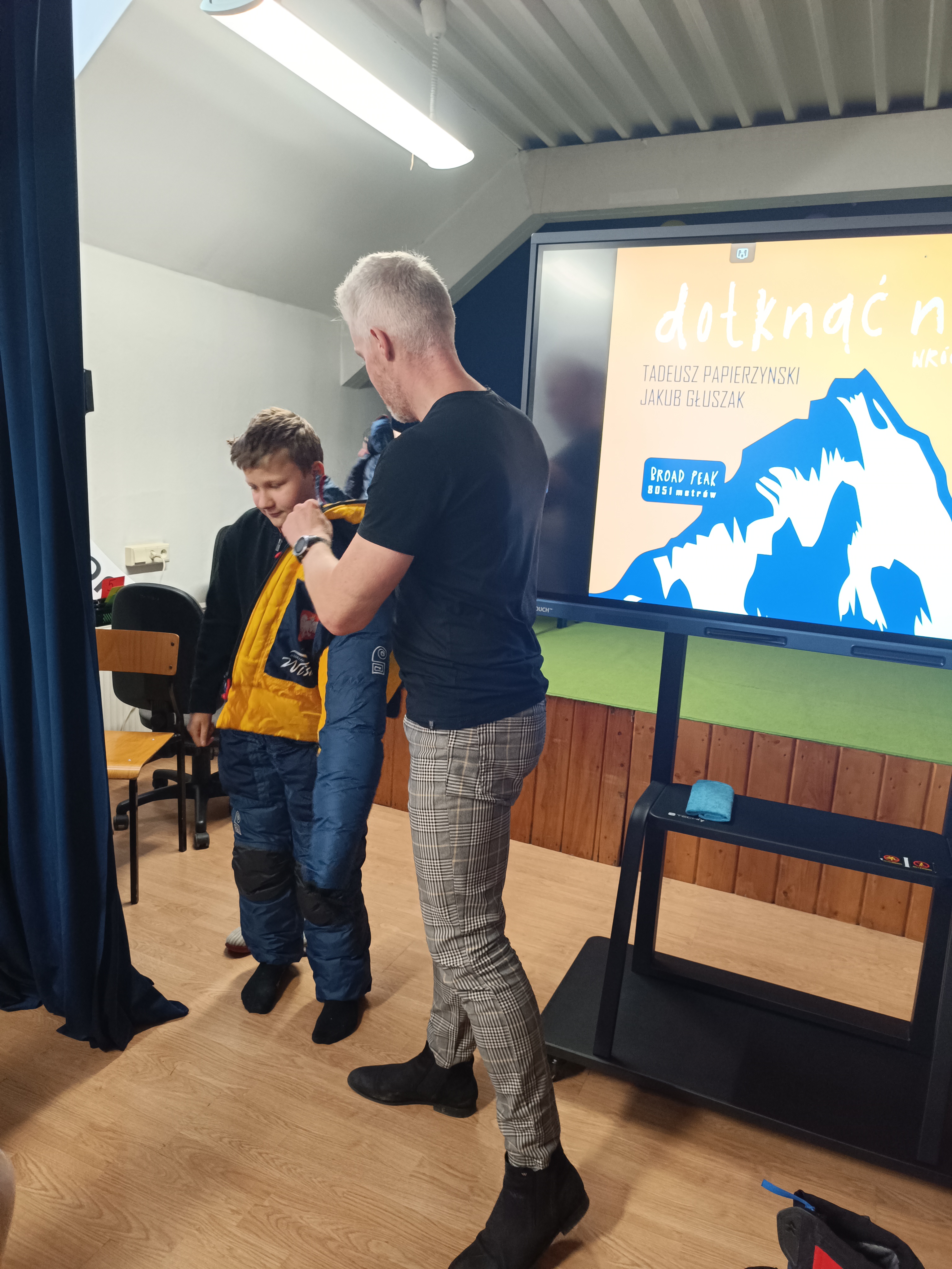 Uczniowie mogli zobaczyć zdjęcia z wyprawy, ukazujące górskie krajobrazy oraz życie w obozach wysokogórskich. Podróżnik zaprezentował również sprzęt wspinaczkowy i specjalistyczne ubrania, których używa się podczas takich ekspedycji – od raków i czekana, po odzież chroniącą przed ekstremalnym zimnem.