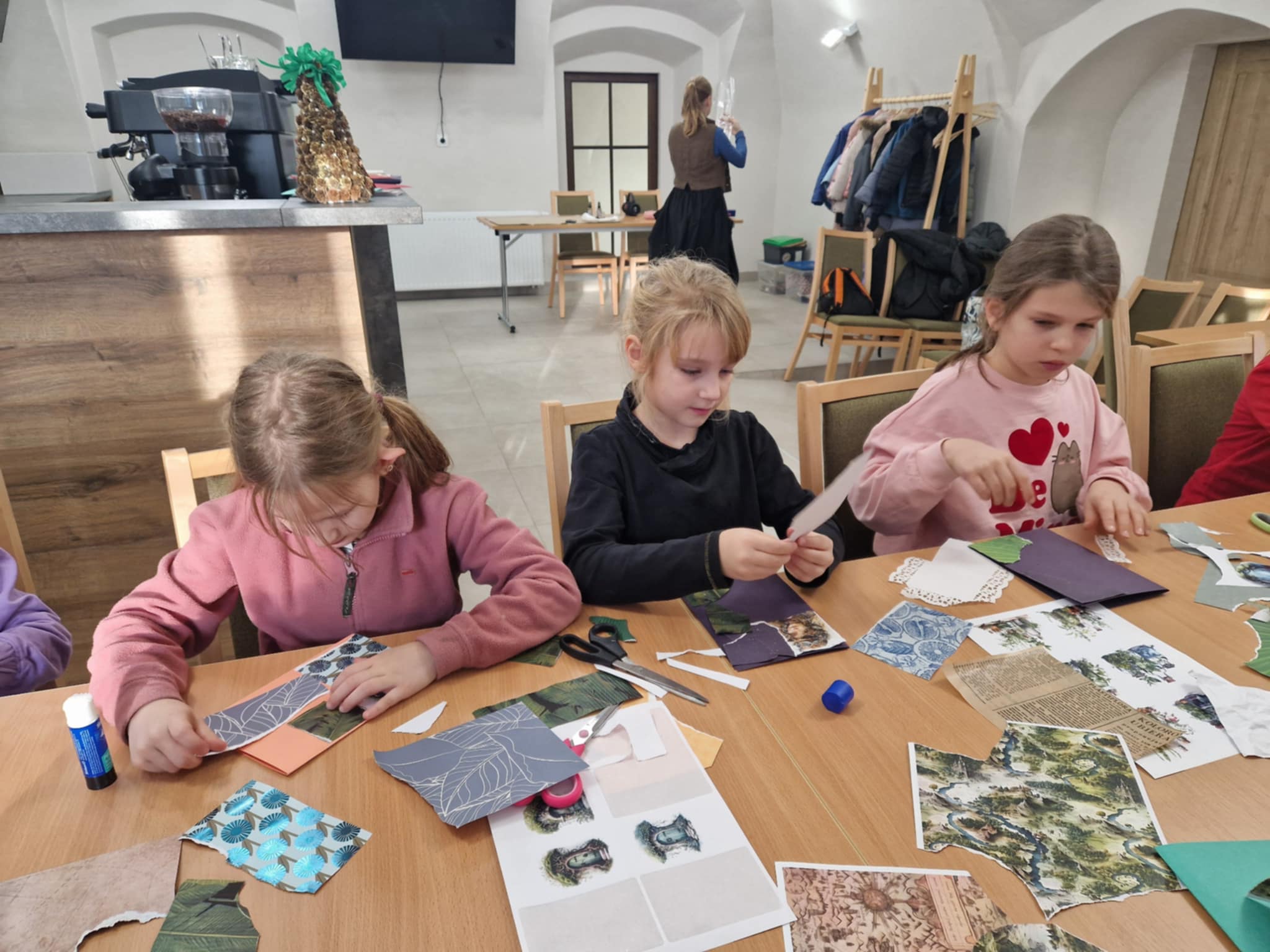 Artystyczne warsztaty polegały na wykonaniu dziennika, w którym można spisywać swoje przeżycia i wklejać pamiątki. Do dyspozycji mieliśmy dużo ciekawych kart graficznych, różnorodnych rodzajów papieru i tasiemek.