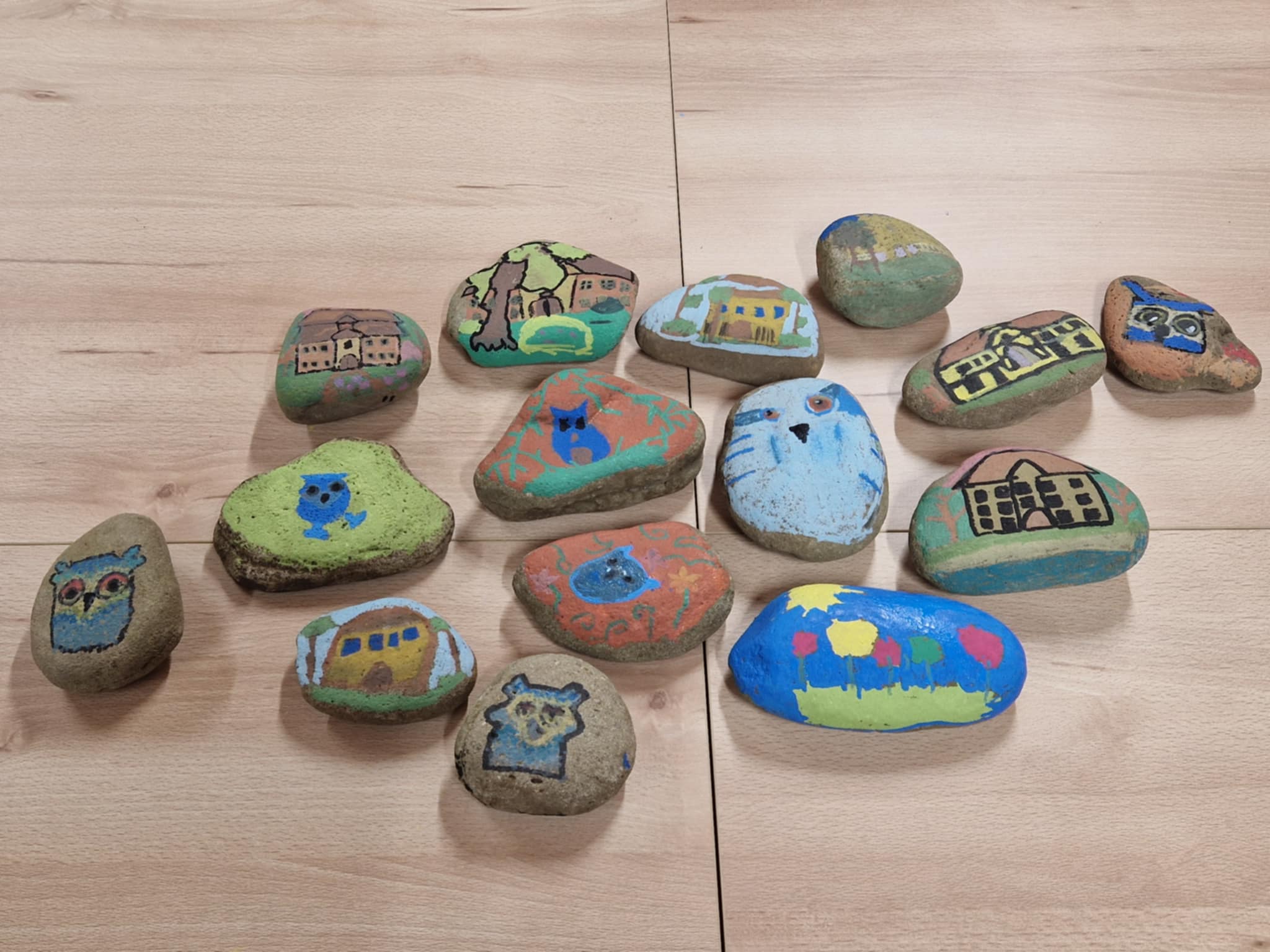 Drugą formą było malowanie na kamykach motywów kojarzących się z bajką lub samym miejscem naszego pobytu. Przy okazji pojawił się też duszek Kacperek w postaci kukiełki. Po pracy niektórzy chowali kamyczki w ogrodzie otaczającym Centrum, a inni zabierali do domu.