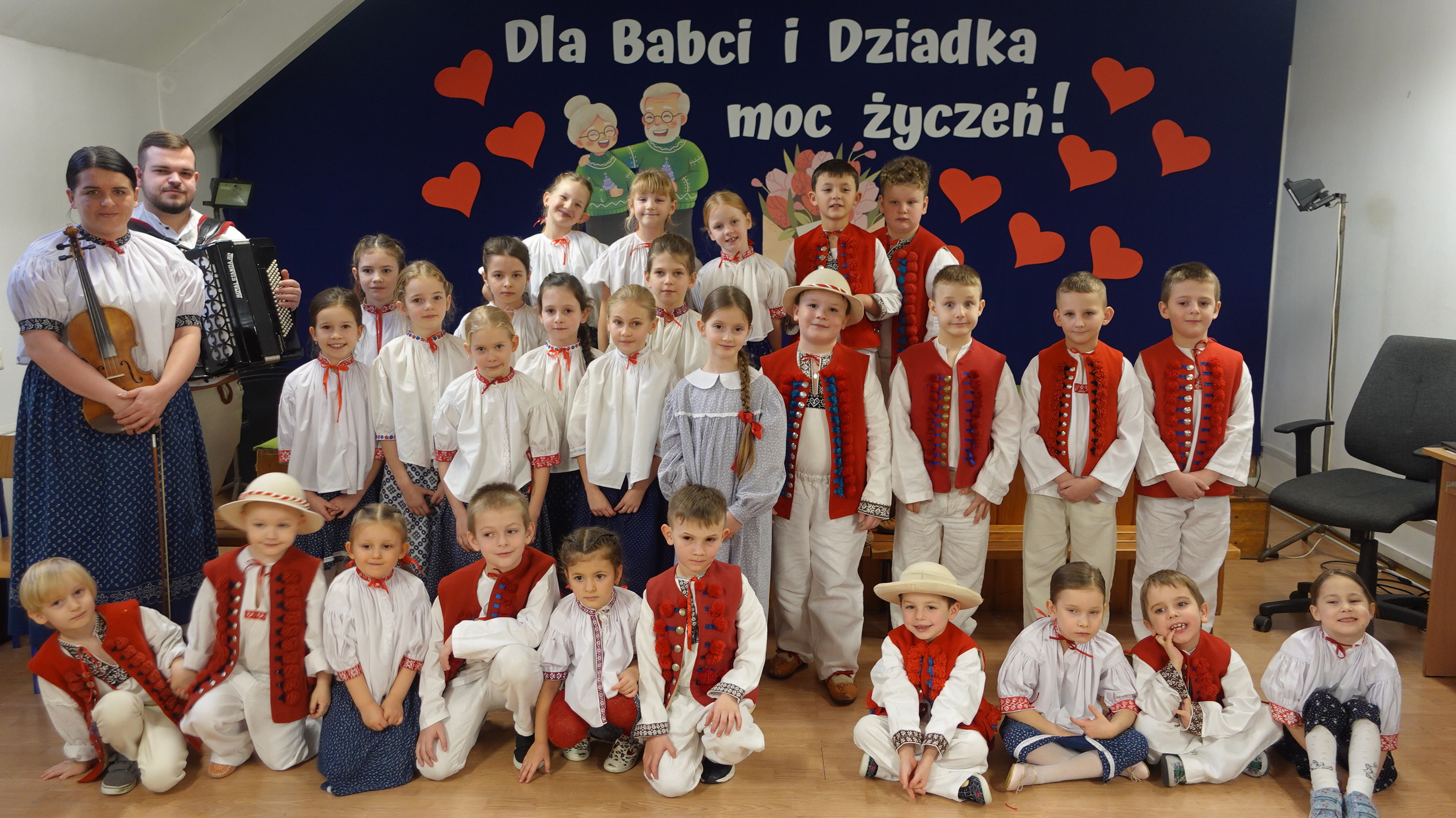 Dzieci zaprezentowały piękny program artystyczny – tańce i śpiewy regionalne, a także wiersze i piosenki przygotowane specjalnie dla swoich ukochanych dziadków. Nie zabrakło życzeń, podziękowań oraz ciepłych słów płynących prosto z dziecięcych serc.