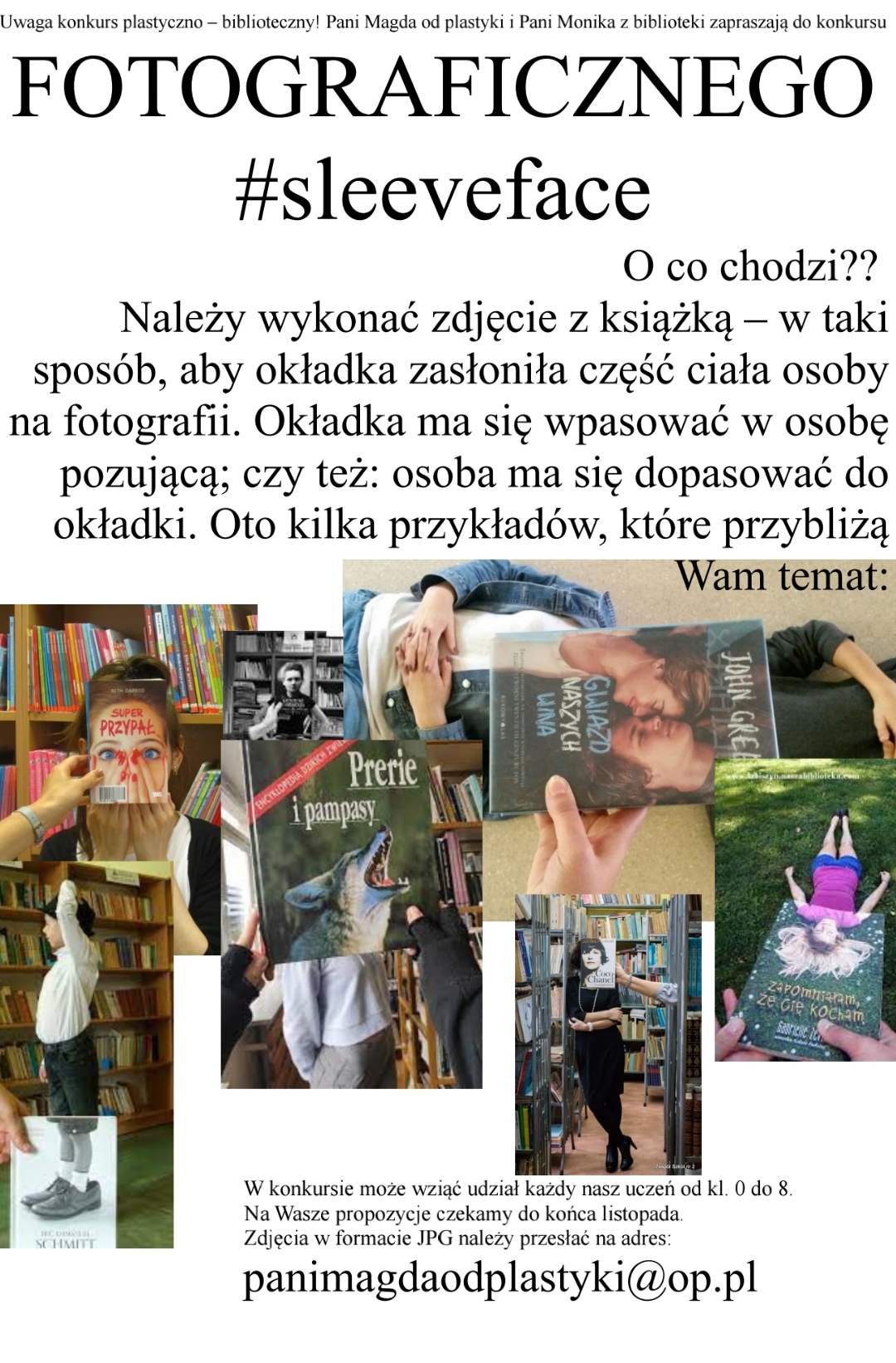 Zadaniem uczniów było wykonanie zdjęcia z okładką książki przedstawiające osobę z zasłoniętą przez książkę częścią ciała.Organizatorkami konkursu były pani Magda Krężelok i pani Monika Baraniok.