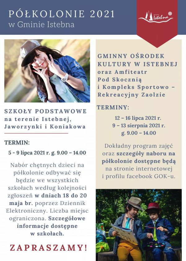 Termin zapisywania dzieci na półkolonie został wydłużony do piątku 28 maja br. Planowany termin półkolonii to 5 - 9 lipiec br, po 5 godzin dziennie. Półkolonie są bezpłatne. Więcej informacji dostępnych jest na dzienniku elektronicznym.