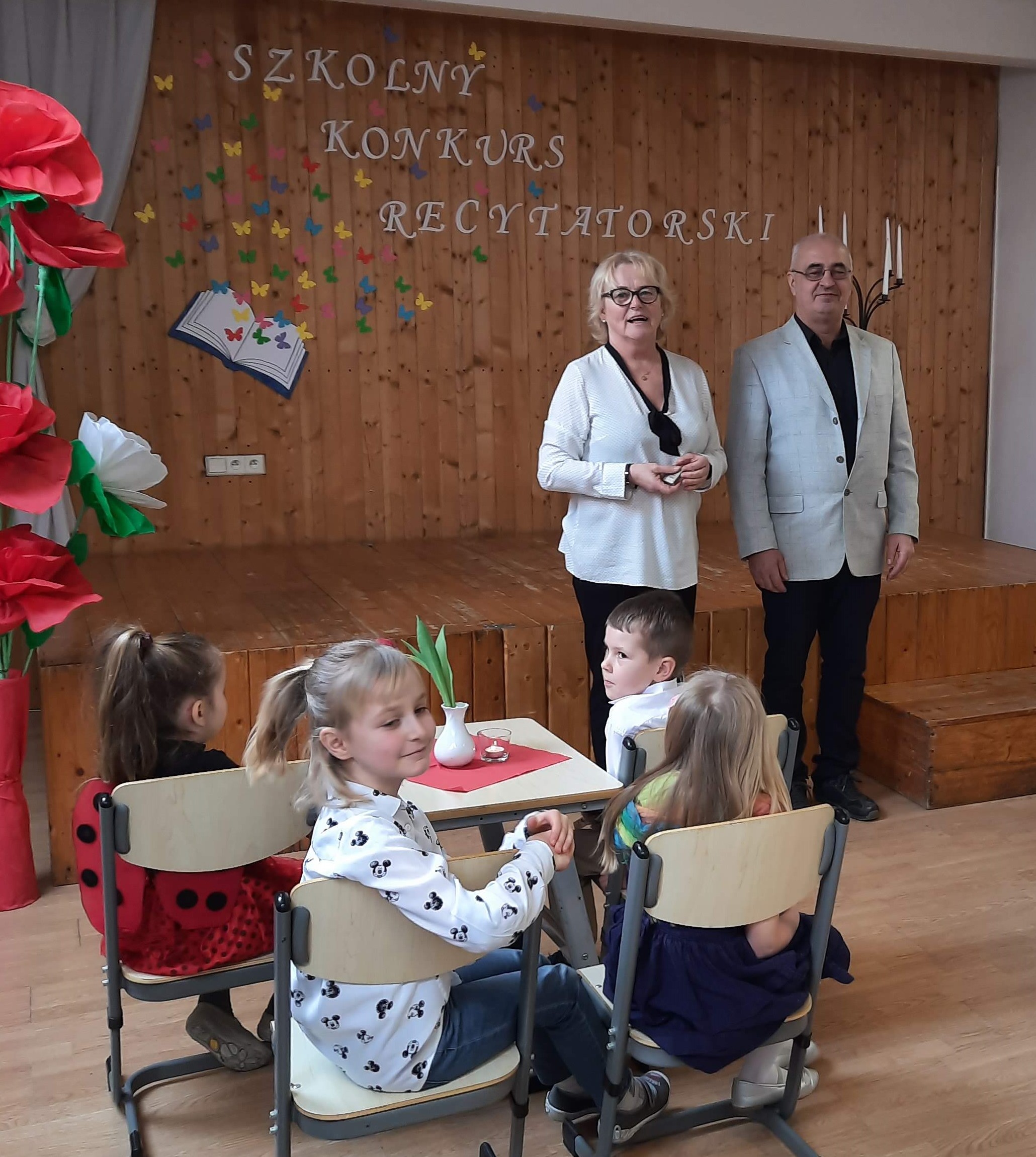 5 lutego 2021 odbył się w naszej szkole Konkurs Recytatorski dla uczniów klas 0-3. Głównym pomysłodawcą i organizatorem była oczywiście p. Ewa Czulak, która w tego rodzaju przedsięwzięciach nie ma sobie równych... Przygotowania musiały być jednak dobrze przemyślane, ponieważ wszystko należało zorganizować według obowiązujących procedur funkcjonowania szkoły w okresie pandemii. W zaplanowaniu i tworzeniu scenografii pomagały p. Mirosława Haratyk i p. Edyta Kukuczka a przygotowaniem uczniów do występu zajęli się wychowawcy klas i rodzice. Jedna z sal lekcyjnych zamieniła się w tym dniu na kawiarenkę, gdzie dzieci przy pięknie nakrytych stołach pełnych pyszności mogły wysłuchać recytacji kolegów z klasy.