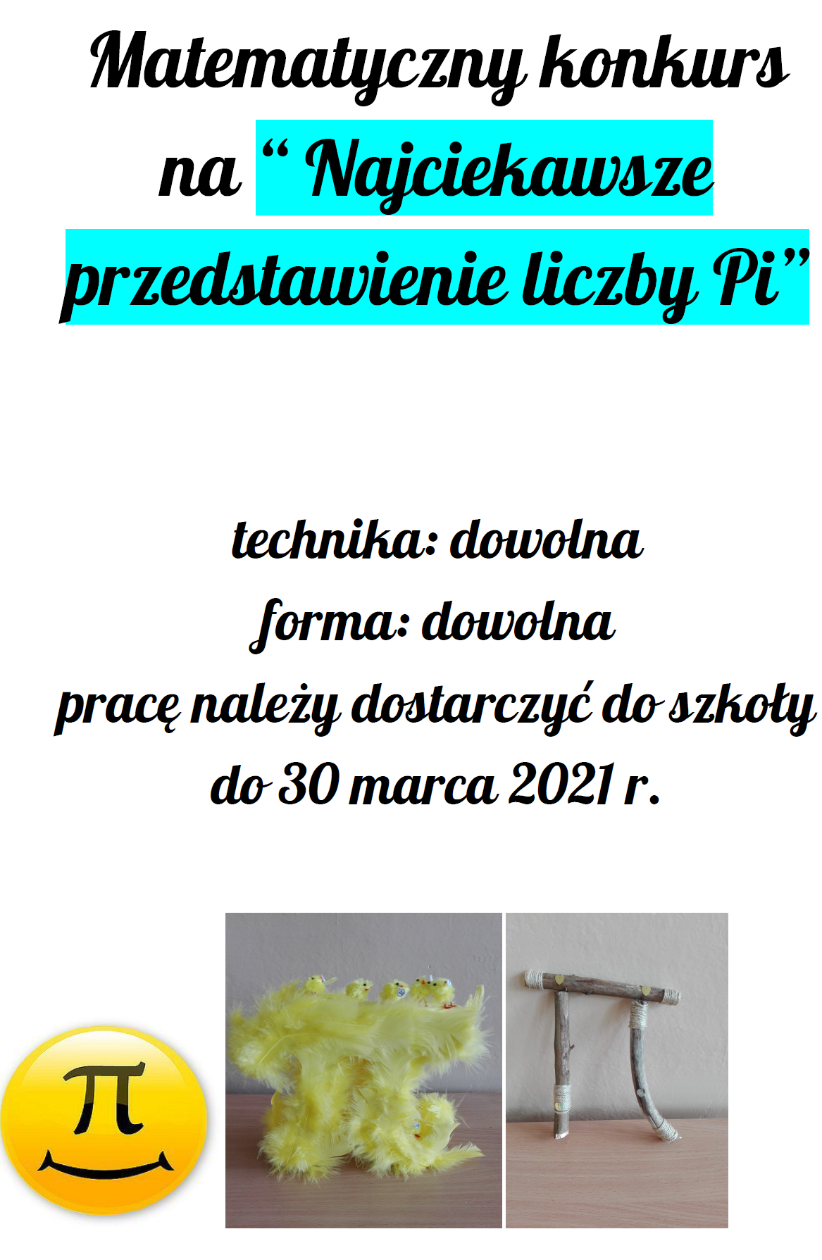 Z okazji międzynarodowych obchodów dnia liczby Pi, które przypadają 14 marca zachęcam do udziału w konkursie matematycznym na "Najciekawsze przedstawienie liczby Pi". Szczegóły na plakacie.